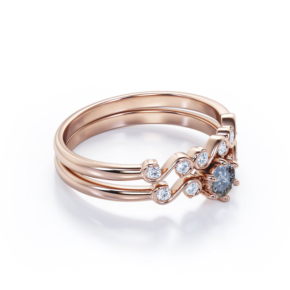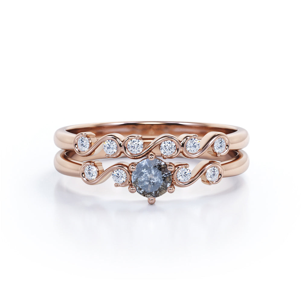 IMPORTANT NOTE: Since each Salt and Pepper Diamonds is one of a kind, the actual color of it may vary from the one that is pictured above. Thanks to its enchanting black and white inclusions, this Lovely Twist Solitaire 0.85 Carat Round Cut Dark Grey Salt and Pepper Diamond Art Deco Wedding Ring Sets will be as unique as its wearer. This filigree ring features .50 carat round cut natural Salt and Pepper Diamond and .35 carat real side Diamond for gold ring and Moissanite for silver ring. This vintage bridal set rings can be customized to either 10k, 14K and Gold over Silver and either Black Gold, Rose Gold, White Gold or Yellow Gold. Also, as your satisfaction is our most priority, we will do our best to have your handmade jewelry be carefully and beautifully crafted by our expert jewelers. The order also comes with a 30-day full refund policy. Ideal gift for any special occasion, this ring can be gifted on birthday, anniversary, Valentine's day, Christmas, and proposal. With its quirky colors and inclusions, this ring will surely match your unique love story. Ornament and distinguish your love story with the neat distribution of black and white inclusions of Salt and Pepper Diamond. It provides an ideal way to stand out from crowd with a gorgeous and distinctive ring. Design and create your very own unique ring that makes you outstanding from the rest! With its especial color ranging from silky grays to stormy almost blacks, no two Salt and Pepper Diamond rings are alike. Those who has a penchant for vintage and flawless ring would completely fall in love with this affordable ring. If you are in search of a unique gift for any occasion, this stunning Salt and Pepper Diamond ring is the best answer for you. With its mesmerizing salt and pepper inclusions, it is sure to enchant your special someone with gracefulness.