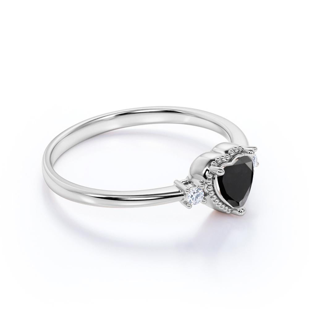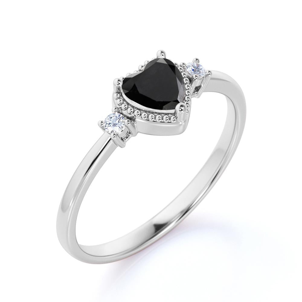 This affordable black diamond ring is the best for you, not just by the look but the price and quality as well. If you don't want a modern black diamond ring, this classic black diamond ring is the best for you. It reminisce your past and those times when you and her are still young lovers. This black diamond ring features an approximately .75 carat heart shaped lab created black diamond, surrounded by .10 carat authentic diamond accent, for a total weight of 0.85 carats.