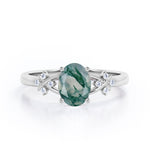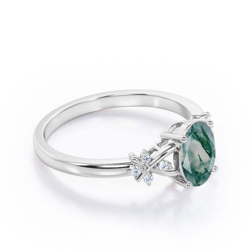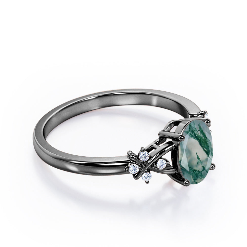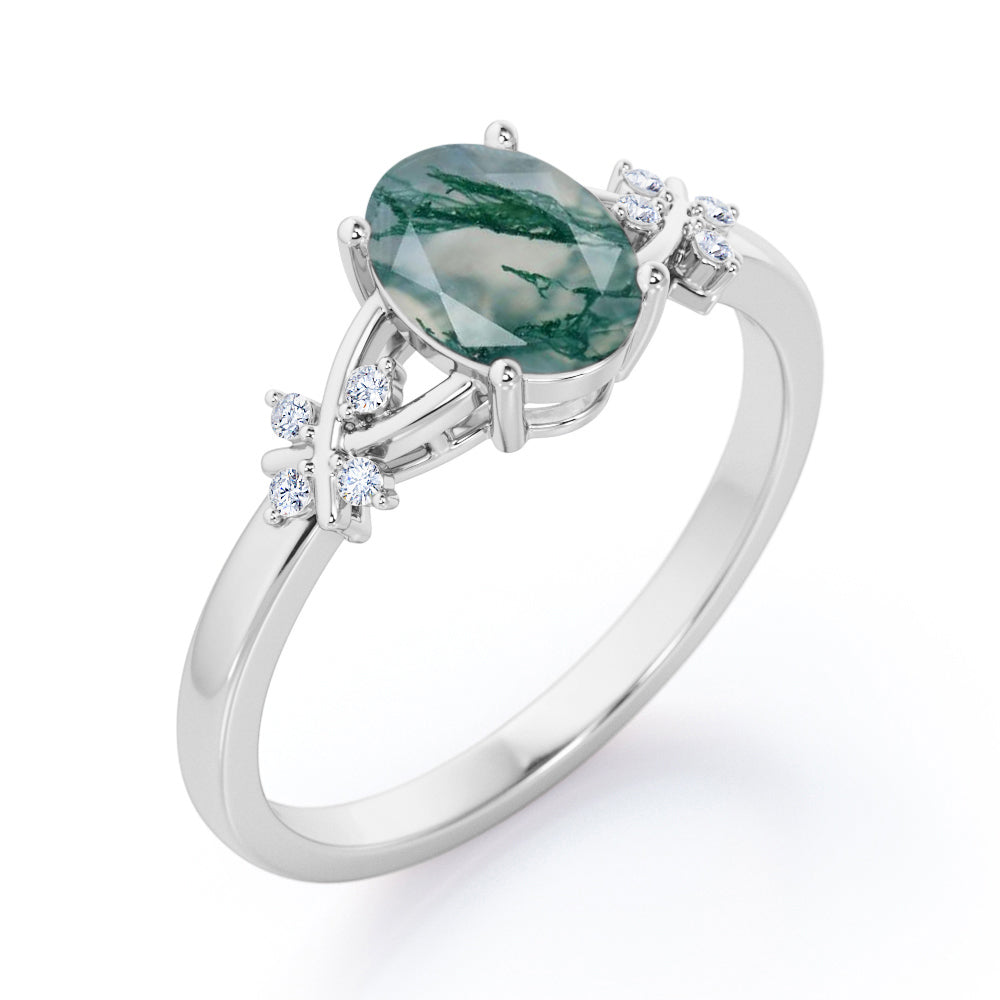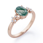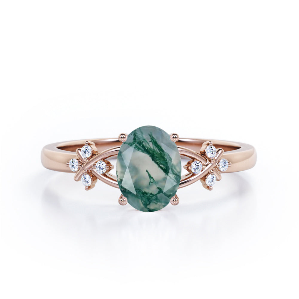 Luxurious Clover Lucky Leaf 0.5 carat Oval Moss Green Agate and Diamond Engagement Ring in Rose Gold shows a simple design which make the ring looks classy and elegant. A 0.5 carat oval Moss Green Agate is placed on a split shank band while the band holds 4 round dainty diamonds. The is twisted, portraying a cross symbol and garnished with gleaming stones. The ring can be made in 18k gold over silver, 10k gold and 14k gold with the color of white gold, rose gold, yellow gold and black gold.