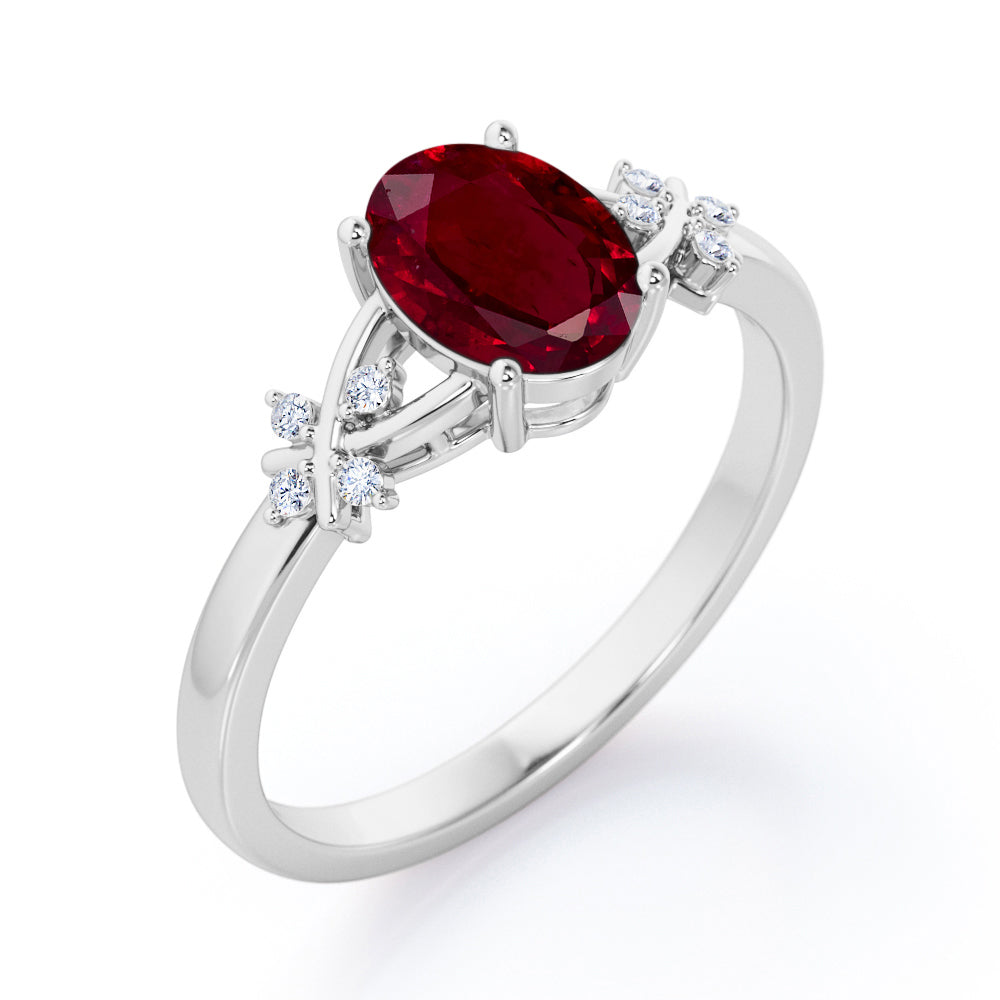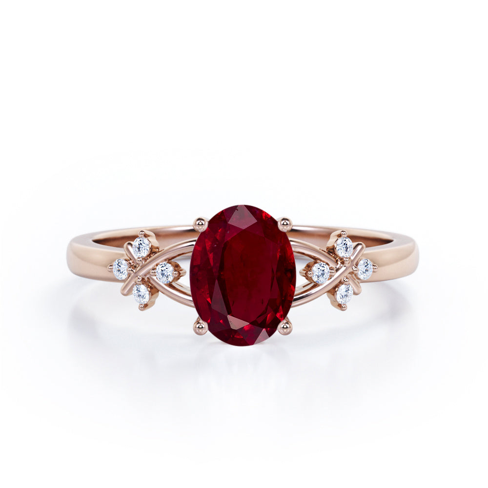 Luxurious Clover Lucky Leaf 0.5 carat Oval Lab-Created Ruby and Diamond Engagement Ring in Rose Gold shows a simple design which make the ring looks classy and elegant. A 0.5 carat oval Ruby is placed on a split shank band while the band holds 4 round dainty diamonds. The is twisted, portraying a cross symbol and garnished with gleaming stones. The ring can be made in 18k gold over silver, 10k gold and 14k gold with the color of white gold, rose gold, yellow gold and black gold.