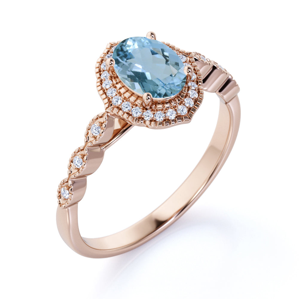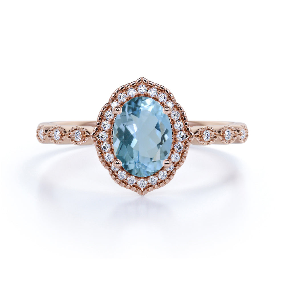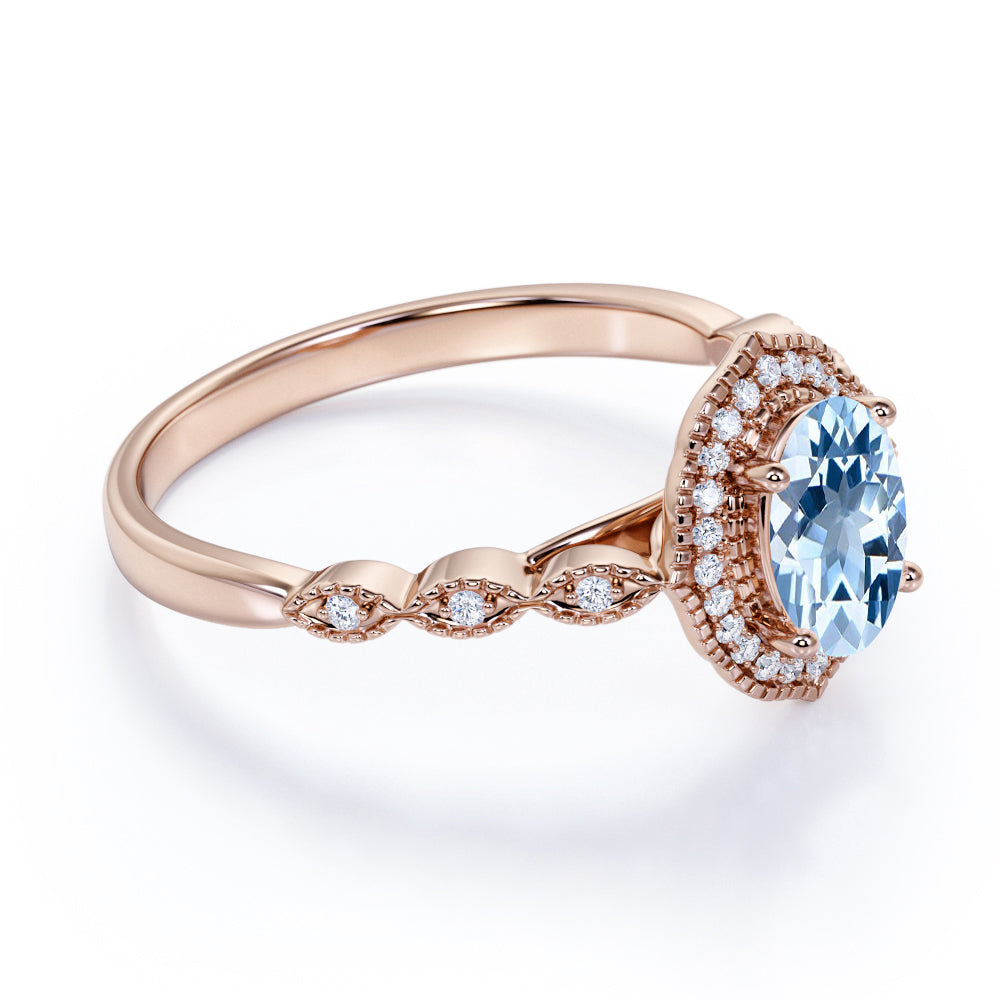 Massive 1.50 Carat Ovate Deep Blue Aquamarine and Diamond Modern Art Deco Engagement Ring in Rose Gold
