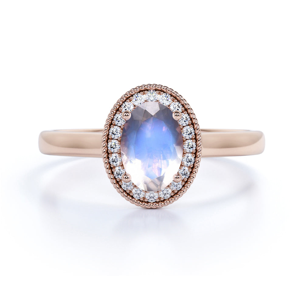 This petite moonstone ring is very cool and comfortable, it is also great for daily wear or even a proposal ring for her. If you don't want a modern moonstone ring, this classic moonstone ring is the best for you. It reminisce your past and those times when you and her are still young lovers. This moonstone ring features an approximately 1 carat oval shaped certified moonstone, surrounded by .25 carat authentic diamond accent for gold ring and moissanite for silver ring, for a total weight of 1.25 carats.