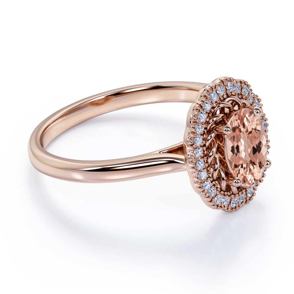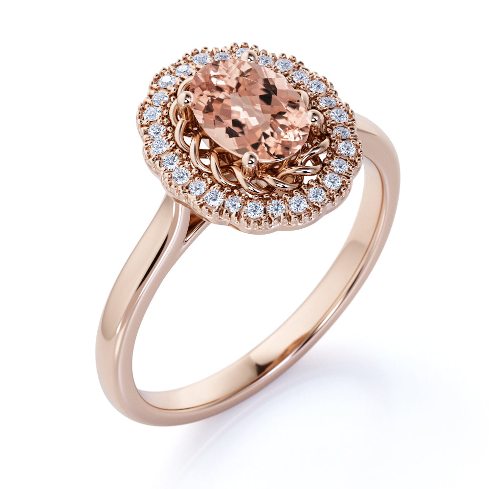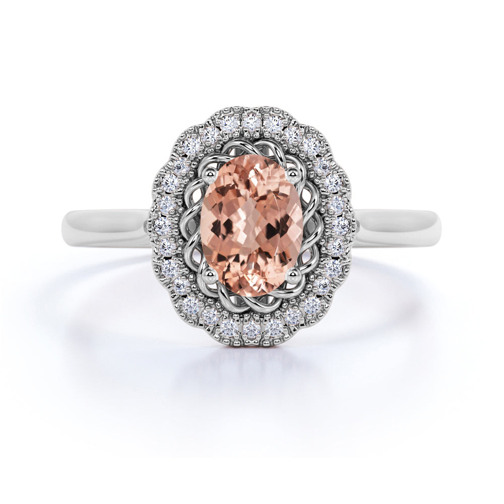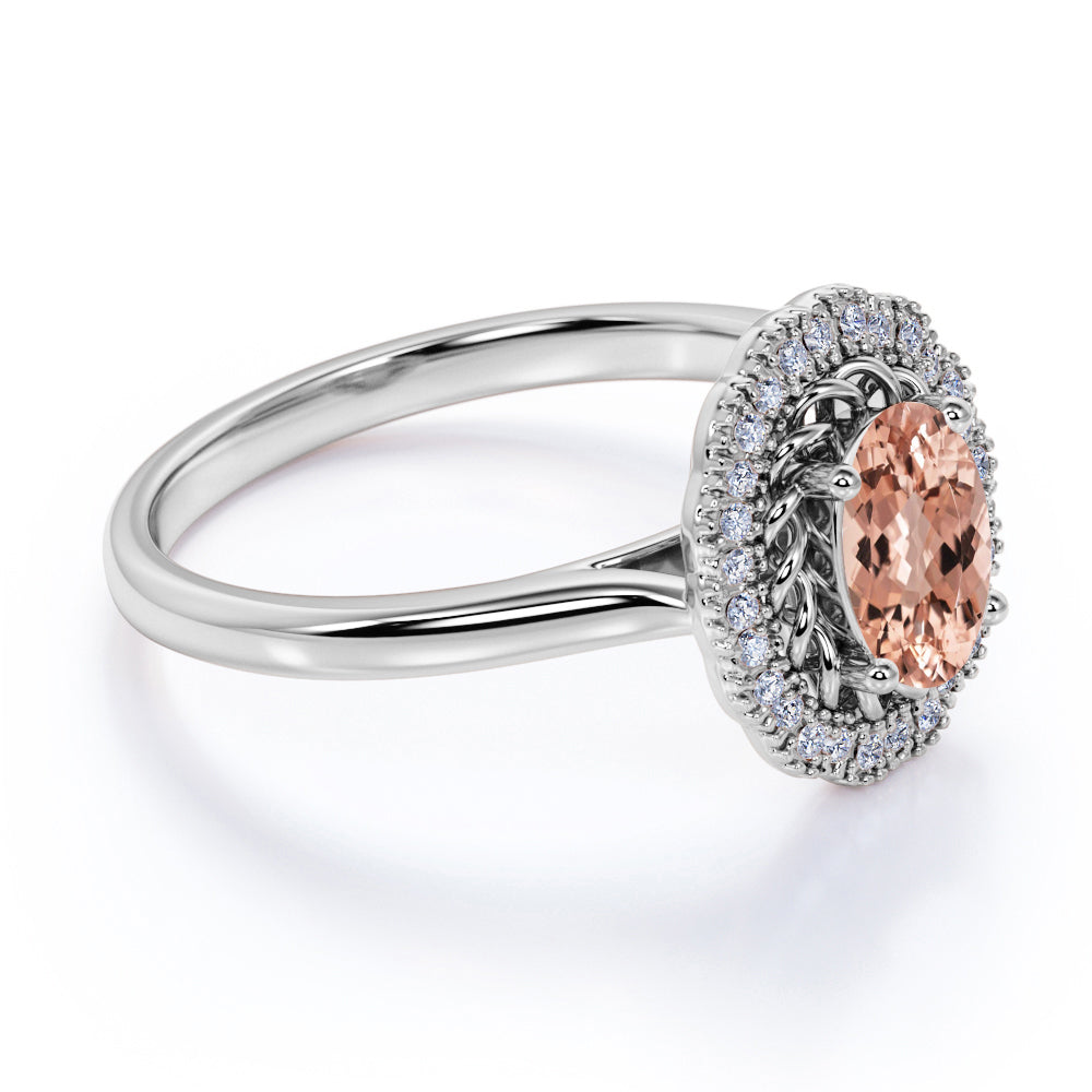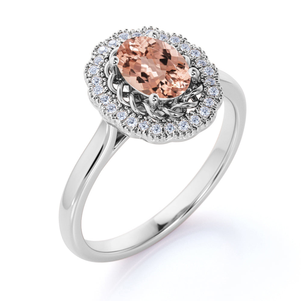 Massive 1.25 Carat Oval Pink Salmon Morganite and Twisted Diamond Halo Engagement Ring in White Gold