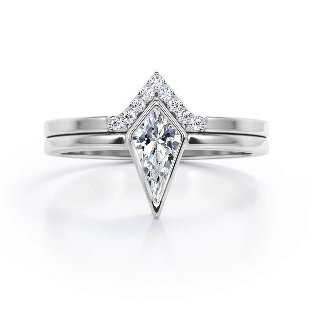 Matching Bezel 1.1 carat Kite Moissanite and Diamond Wedding Set in White Gold
