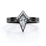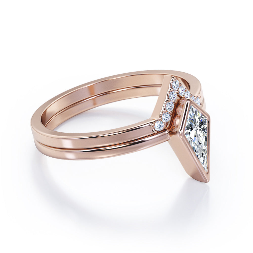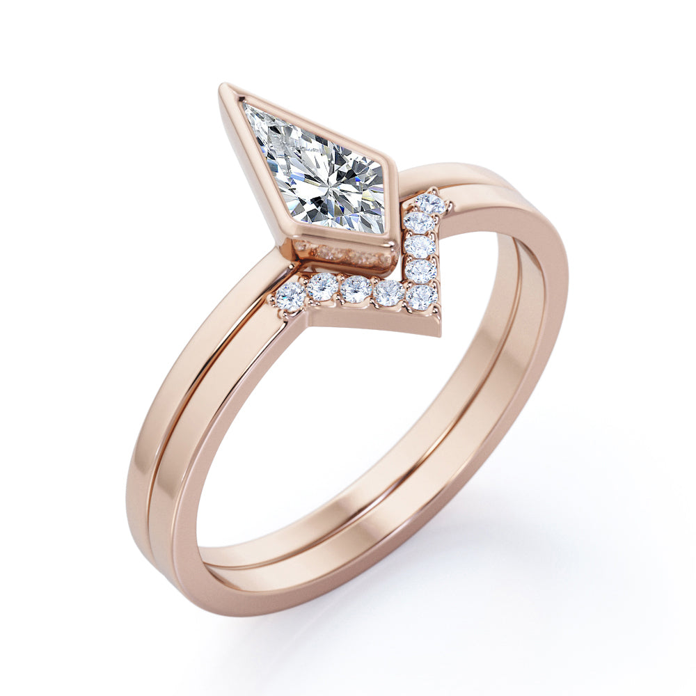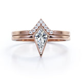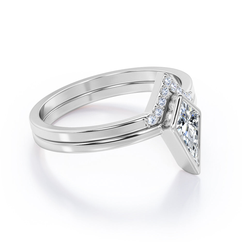 Matching Bezel 1.1 carat Kite Moissanite and Diamond Wedding Set in White Gold would be a pleasant choice to surprise your lover if they are in love with minimal jewelry. The engagement ring showcases a 1 carat kite Moissanite in bezel setting and it is complimented by V-shaped wedding band that is garnished with petite round diamond. The lustrous Moissanite bridal set can be made in 18k gold over silver, 10k gold, 14k gold with the color of white gold, rose gold, yellow gold and black gold.