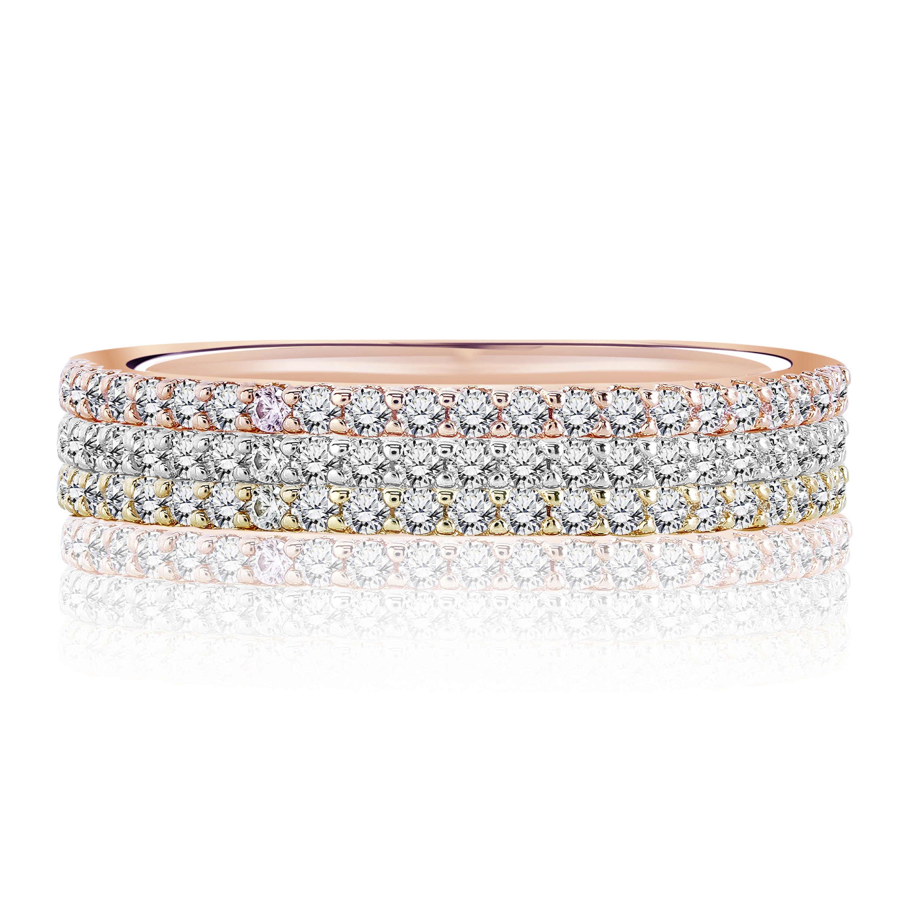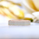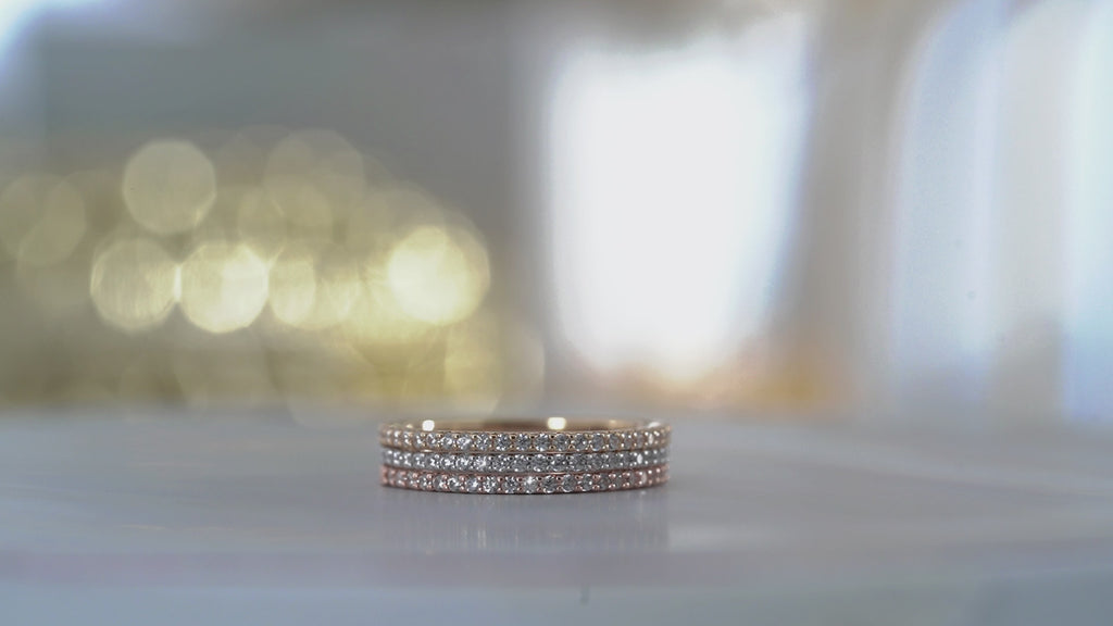 Cherish your loved ones with our Matching Moissanite Micro Pave Wedding Trio Set. This trio micro pave wedding band set includes high-quality Moissanite on three different classic pave rings of different colors which are white, rose, and yellow. All three rings in the trio micro pave set are of the same classic design that can go with other rings that you own or match perfectly as a colorful set. This wedding band set can all be mixed and matched with any type of ring as the design is highly classic and minimalistic. Moreover, these can also serve as matching trio ring sets for friends hence, a strong symbol of your friendship. This sterling silver trio wedding set is the real perfection at the greatest value. The matching trio wedding rings can be worn on many of your special occasions, for example, Mother's Day, engagement, anniversary, Valentine's Day, Christmas, and more. Make your beloved ones' day with this stackable ring set. This wedding band can be customized in 18K white, rose, yellow, or black gold over silver, or in 10K, 14K, and 18K gold, based on your preference.