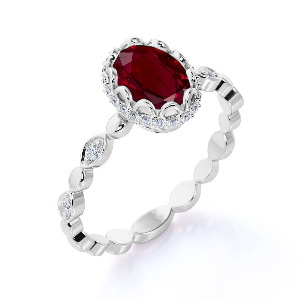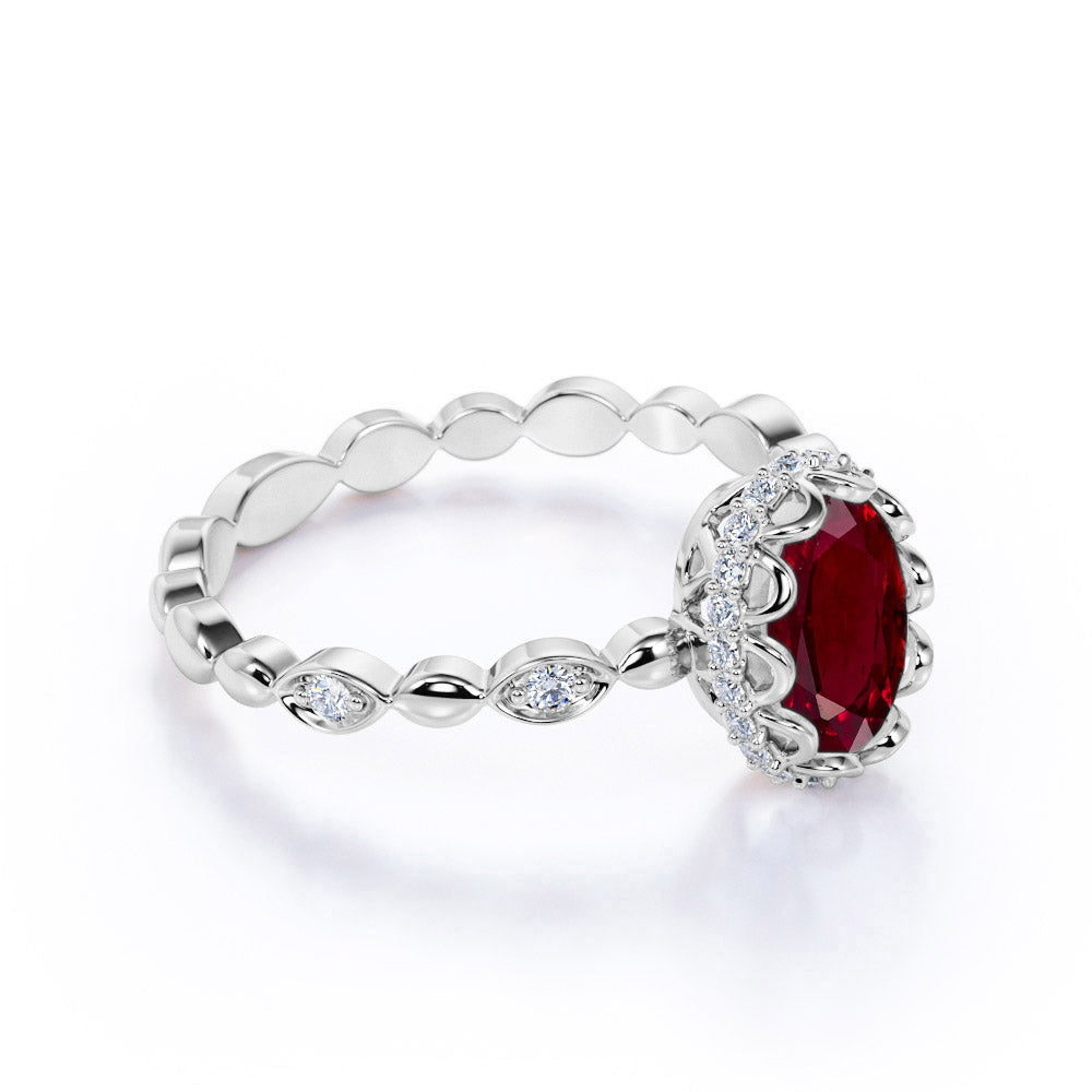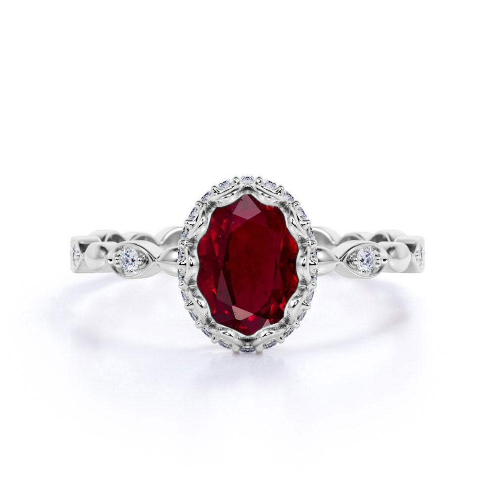 Unique Micro Pave 1.10 Carat Oval Cut Lab-Created Ruby and Diamond Halo Engagement Ring in White Gold