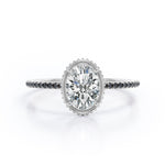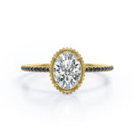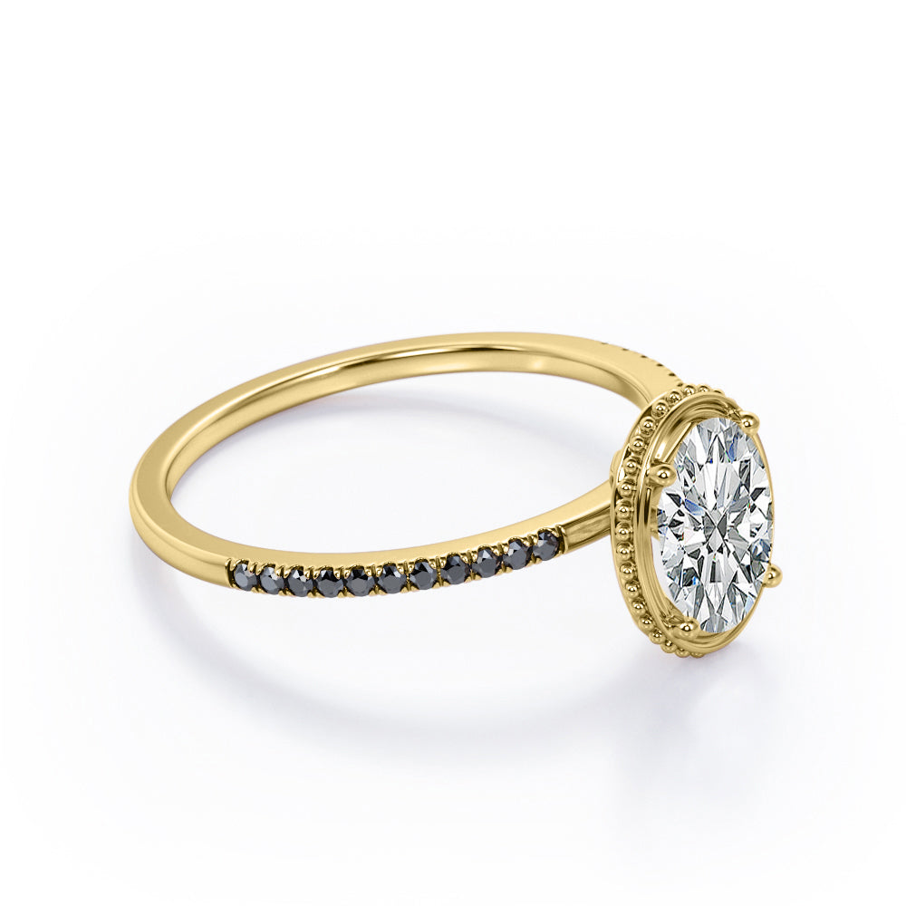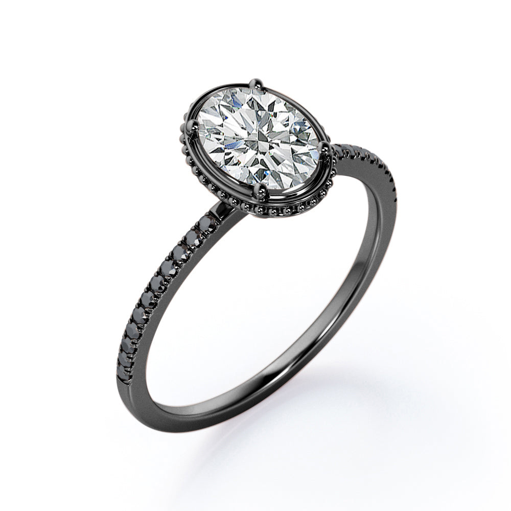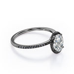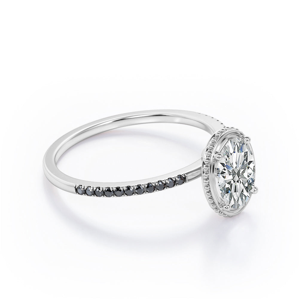 Make your proposal day most memorable with this Milgrain Bezel Prong 1.5 TCW Oval Cut Moissanite with Lab Created Black Diamond Pave Style Engagement Ring in Rose gold. Professionally handcrafted into a fine oval cut by our experts in lapidary, this flawless white moissanite ring consists of total 1.5 carat moissanite and lab-created black diamonds. Special and non-traditional, this moissanite fine jewelry is perfect for those who would love to express their charisma and uniqueness. With naked eyes moissanites look, shine and feel exactly like diamonds. With its glory and clarity, this 925 moissanite ring will absolutely enhance every style of its wearer. This moissanite engagement ring is beautiful and accessible since it is available at a reasonable price. Moissanites are the most popular alternative gemstone for diamonds while being at lower and more affordable price. If you are looking for a special gift for your friends or your better half, this best moissanite ring can definitely help you out. This best moissanite ring can be customized to your own choice of metal colors: White gold, rose gold, yellow gold and black gold in 18k Gold over Silver, 10k and 14k gold metal options. In regards to its hardness, moissanite is almost as hard as diamond which means that it is notably durable. Let’s impress her with this silver moissanite ring and, surely, she will not regret it.