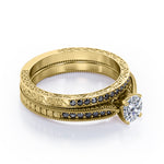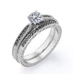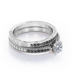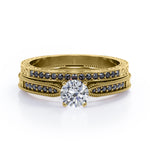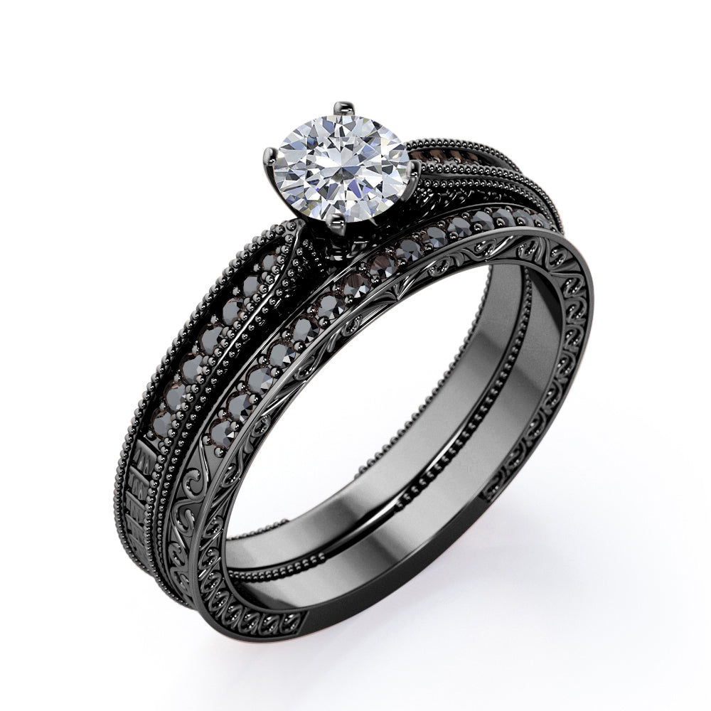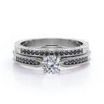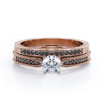 Bring out the sparkle in someone you care about with these Milgrain-Edged 1.5 TCW Round-Shaped Moissanite with Lab Created Black diamond Art Deco Victorian Design Wedding Set in Rose Gold. Hand-cut with deftness into a lovely shape round cut by our most talented jewelers, these astonishing affordable Moissanite engagement rings features total 1.5 carat Moissanite with lab-created Black diamond side stones on solid white gold. Distinct and unusual, these Moissanite promise rings are an excellent choice. With its dazzling beauty, these Moissanite engagement rings are magnificent in its brilliance and clarity and will be an unmistakable addition to any jewelry collection. These affordable Moissanite engagement rings are a great choice for any woman's jewelry collection. If you are looking for a Moissanite ring for any special event, such as a birthday, an engagement, or a marriage proposal, these Moissanite rings are a great option if you are in search for something truly special to give to your special someone. These affordable Moissanite rings can be customized, so customers can choose one of metal colors between White gold, rose gold, yellow gold and black gold in 18k Gold over Silver, 10k and 14k gold metal options. Let's show her how much you care by giving her these Moissanite promise rings.