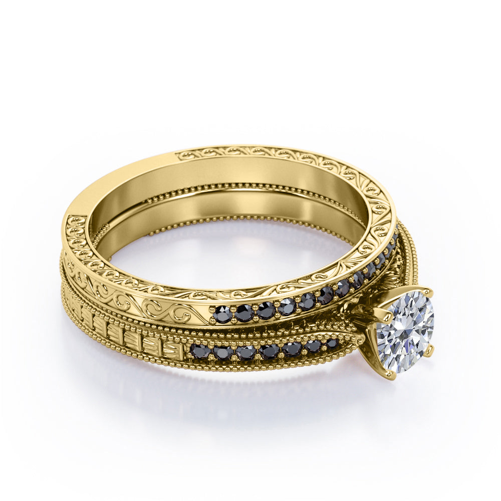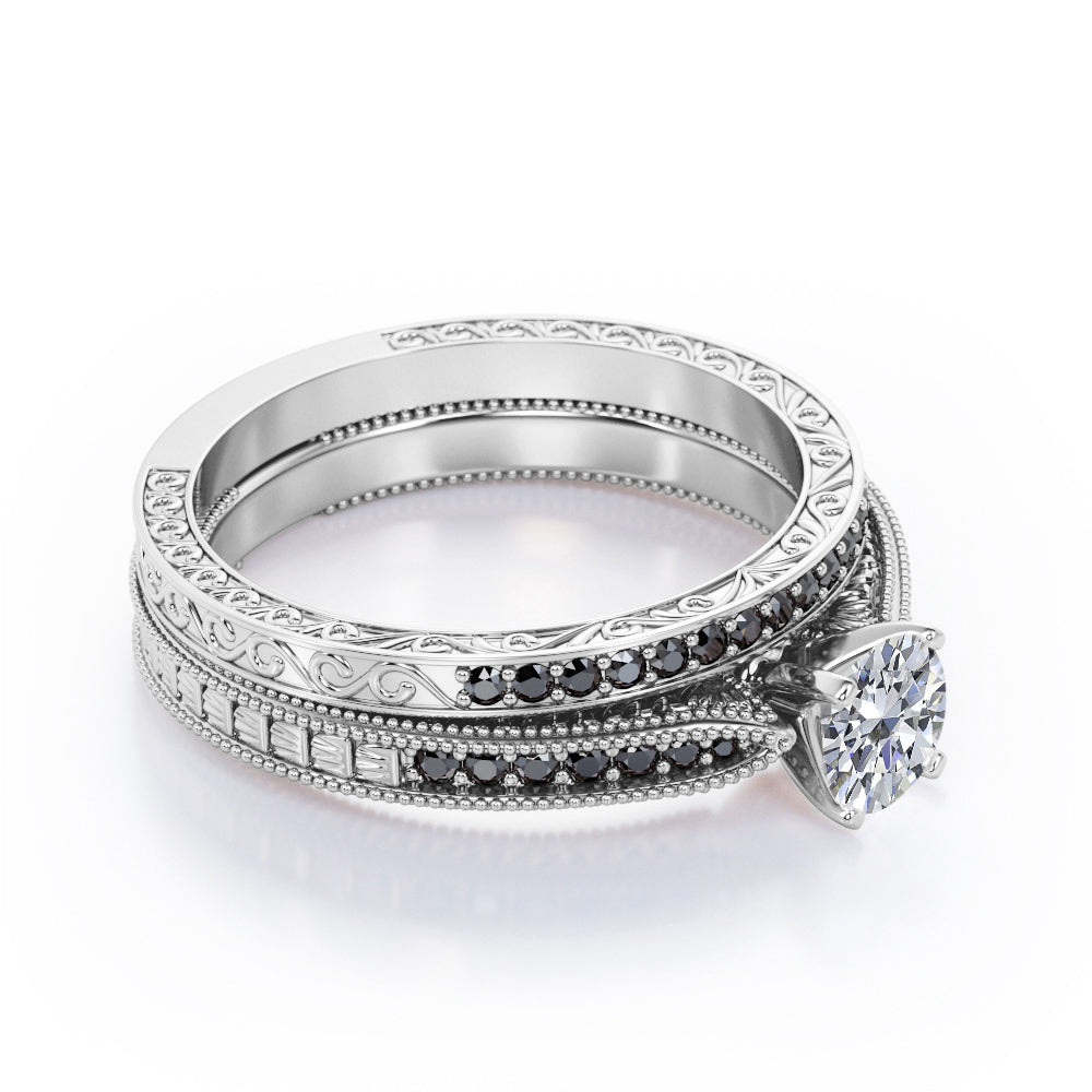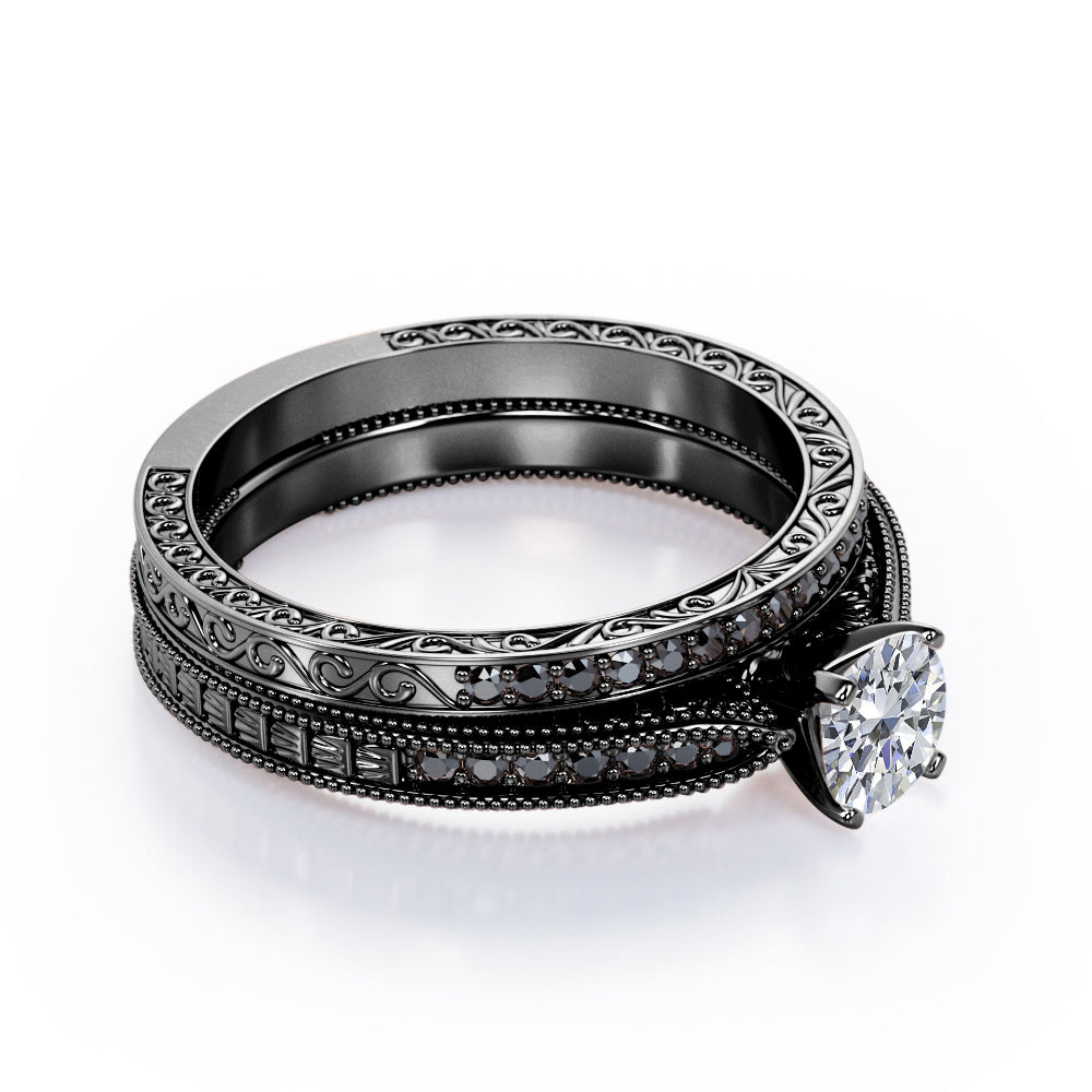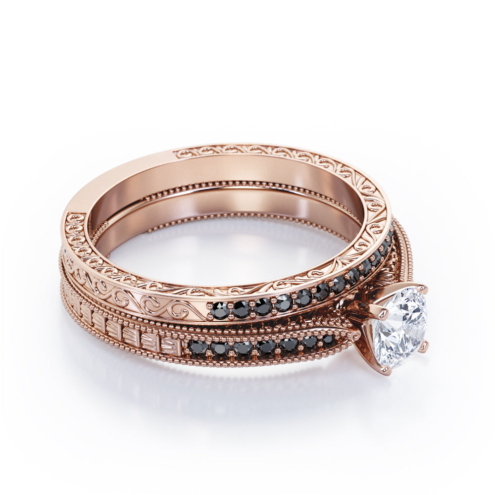 Milgrain-Edged 1.5 TCW Round-Shaped Moissanite with Lab Created Black Diamond Art Deco Victorian Design Wedding Set in Rose Gold