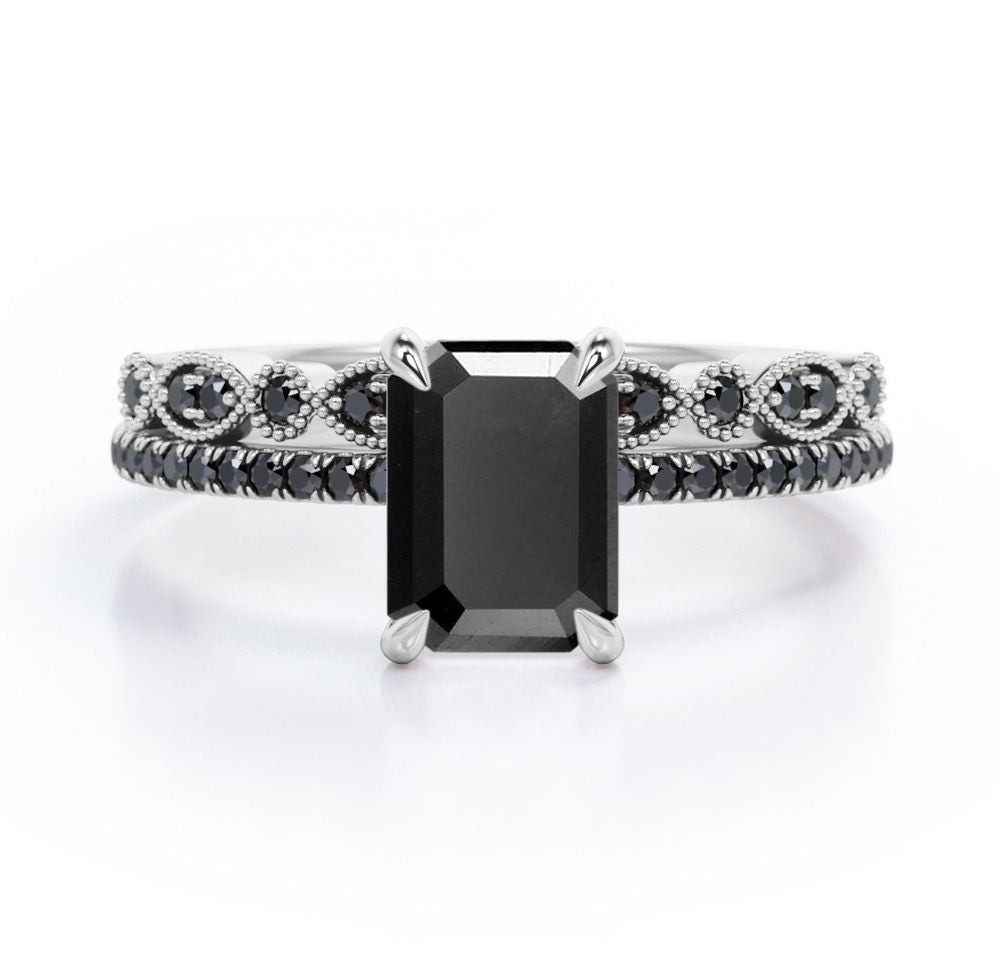 Milgrain Filigree - 1.55 TCW Emerald Cut Lab Created Black Diamond - Pave Accented Bridal Ring Set in White Gold