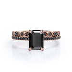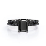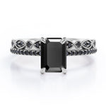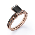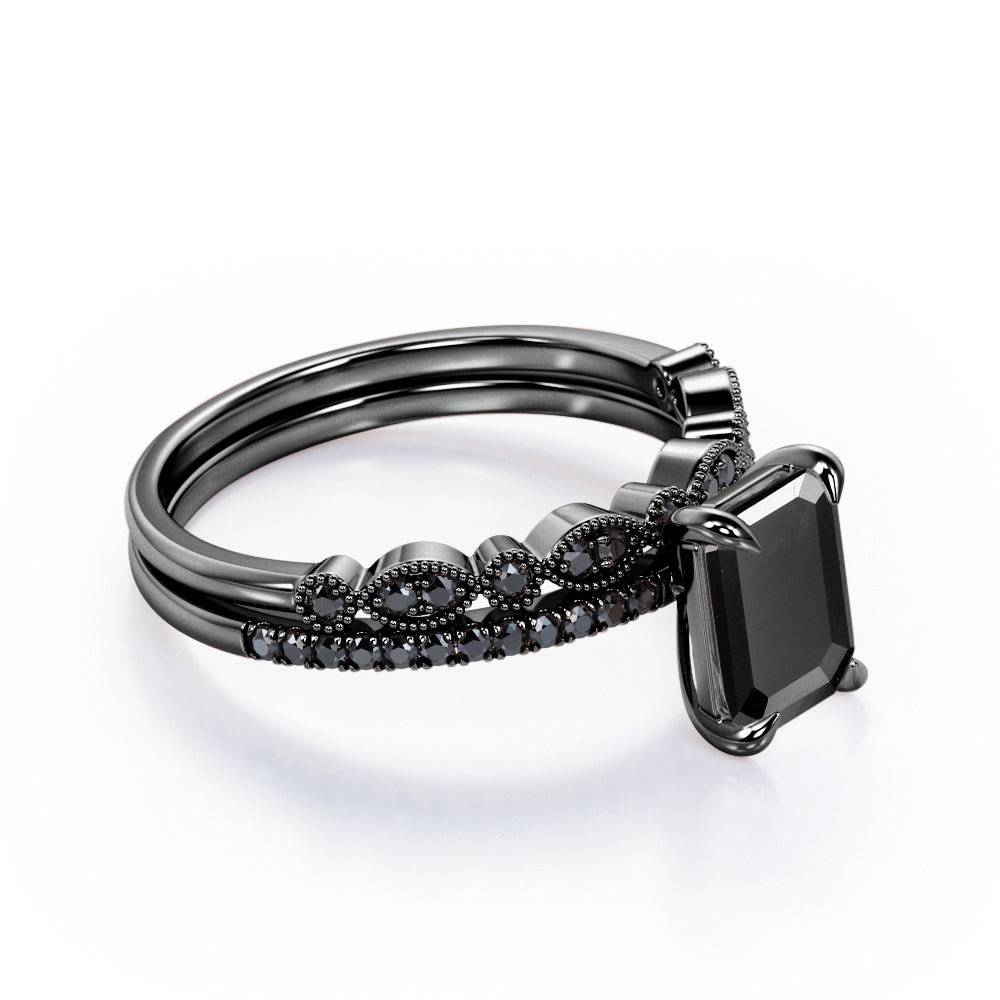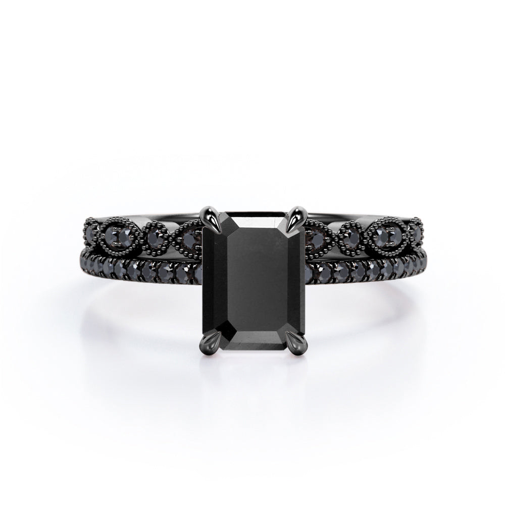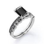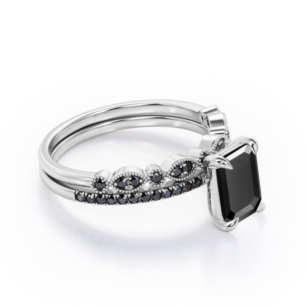 Be highly fashionable with this Milgrain Filigree - 1.55 TCW Emerald Cut Lab Created Black Diamond - Pave Accented Bridal Ring Set in White Gold. Professionally handcrafted into a fine emerald cut by our experts in lapidary, this affordable black diamond jewelry integrates total 1.55 carat lab created black diamond on solid white gold. Distinctive and extraordinary, this synthetic black diamond ring set is perfect for those who would love to express their charisma and uniqueness. With its enchanting color, this black diamond gemstone ring set will unquestionably be an essential additional to any jewelry collection. This statement black diamond rings set is beautiful and accessible since it is available at a reasonable price. If you are looking for a special gift for your friends or your better half, this black diamond stone ring set, symbolically representing love, good fortune and creativity, will be the greatest choice you will ever make. This black diamond anniversary band set can be customized, either in white gold, rose gold, yellow gold or black gold in 10k and 14k gold metal options upon customer request. Let’s impress her with this black diamond ring set and, surely, she will not regret it.