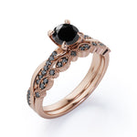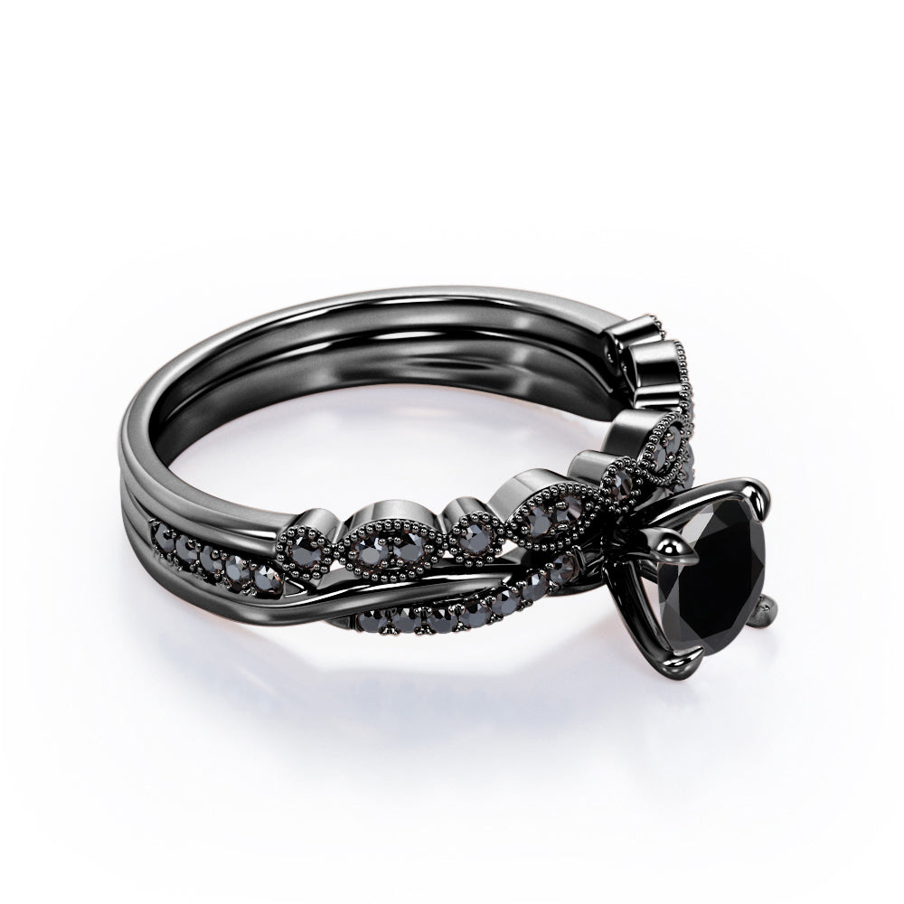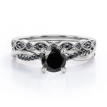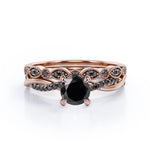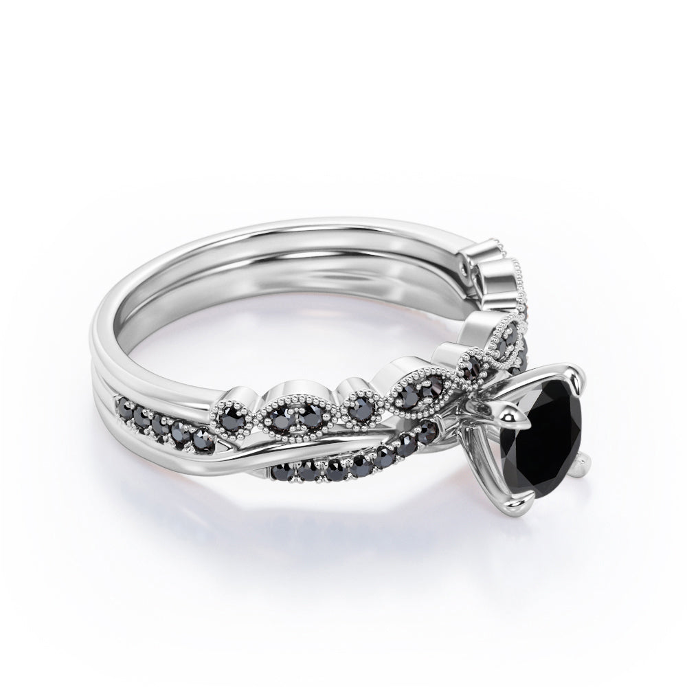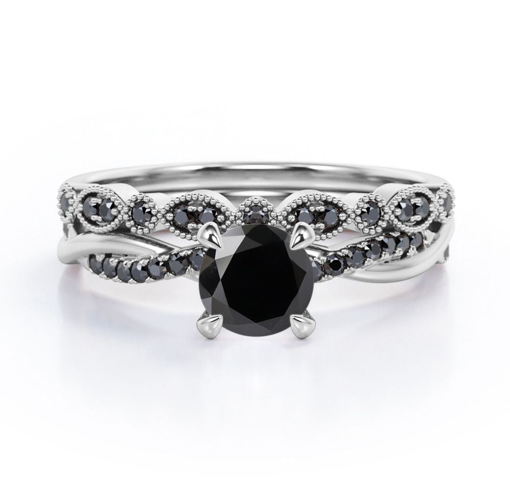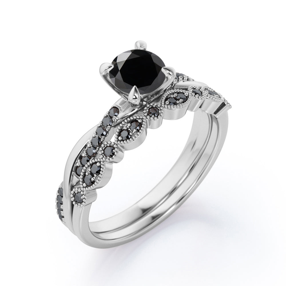 Milgrain Filigree Decorated 1.6 TCW Round Shaped Lab Created Black Diamond Twisted Pave Wedding Set in White Gold