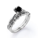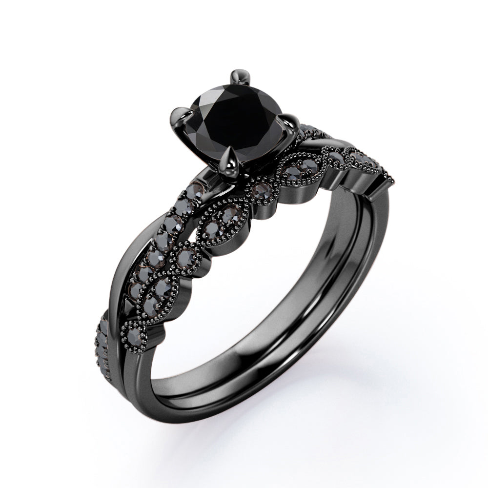 Paint your love story with this Milgrain Filigree Decorated 1.6 TCW Round Shaped Lab Created Black Diamond Twisted Pave Wedding Set in White Gold. Professionally handcrafted into a fine round cut by our skilled jewelers, this flawless black diamond anniversary band set showcases total 1.6 carat lab created black diamond on solid white gold. Distinctive and extraordinary, this synthetic black diamond ring set is perfect for those who would love to express their charisma and uniqueness. With its enchanting color, this black diamond wedding rings set will absolutely enhance every style of its wearer. This black diamond engagement ring set is beautiful and accessible since it is available at an affordable price. This synthetic black diamond ring set can be a good choice for any special occasion, i.e. a birthday ring, an engagement or marriage proposal ring, a Valentines' day ring, etc. Additionally, this black diamond rings set can be customized, so customers can choose one of metal colors between white gold, rose gold, yellow gold or black gold in 10k and 14k gold metal options. Let's fulfill your love story with this black diamond wedding band set and she will be eternally joyful.