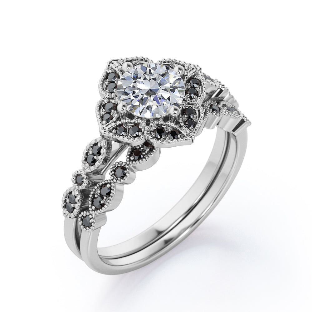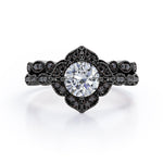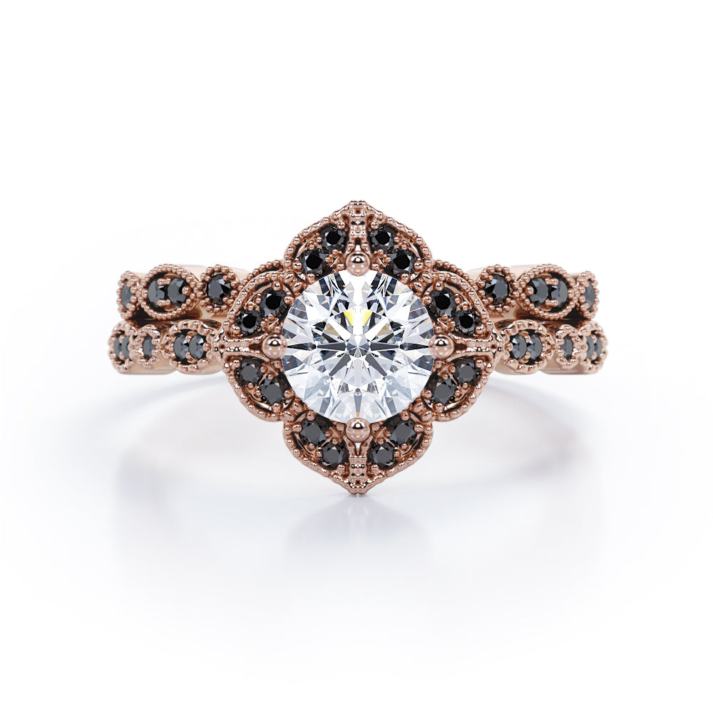Milgrain Floral Cluster - 1.75 TCW Round Cut Moissanite with Lab Created Black Diamond - Filigree Bridal Ring Set in Rose Gold