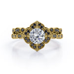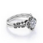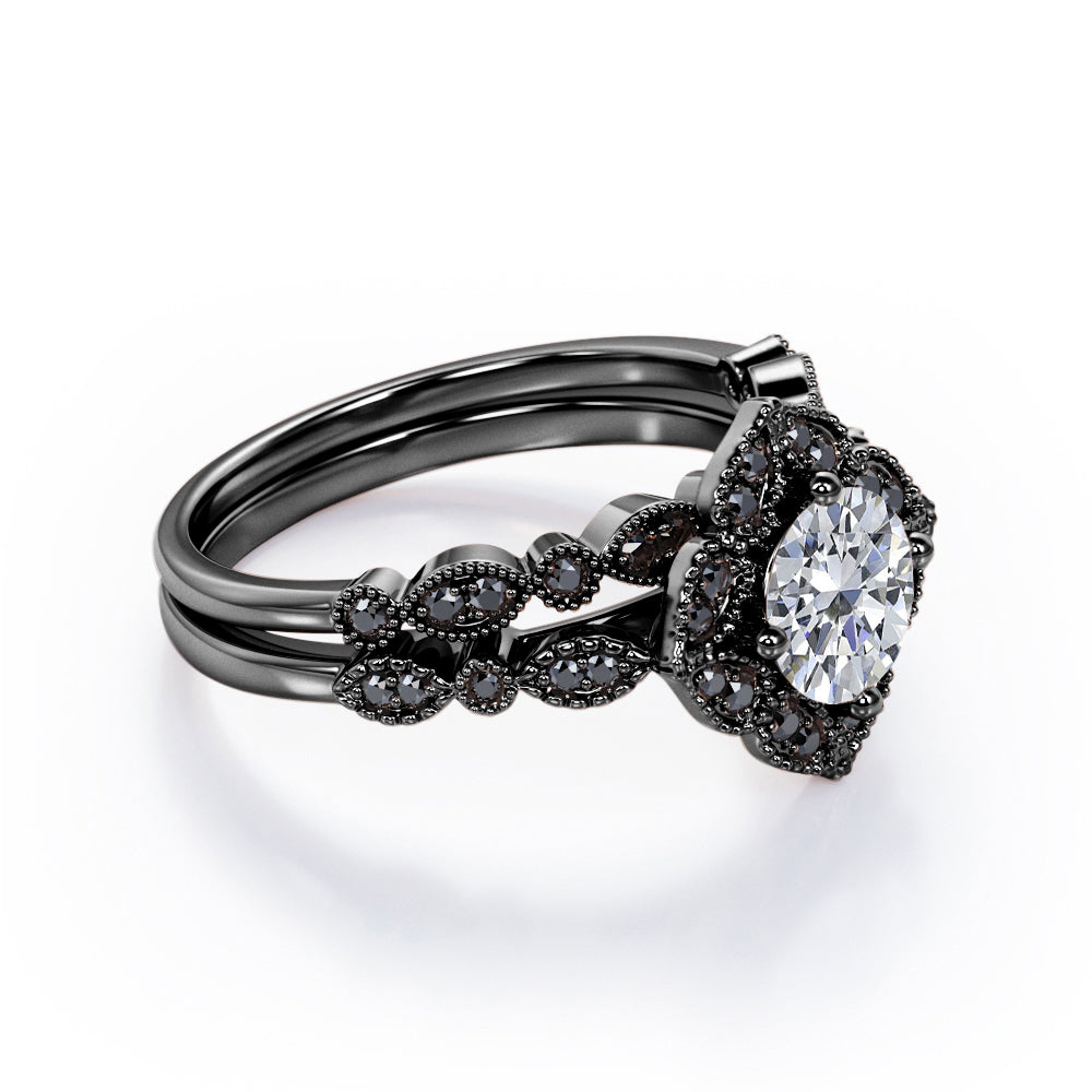 Make every day a cloud nine day with this Milgrain Floral Cluster - 1.75 TCW Round Cut Moissanite with Lab Created Black Diamond - Filigree Bridal Ring Set in Rose gold. Skillfully hand-cut into a nice round cut by our skilled jewelers, this elegant moissanite anniversary band set integrates total 1.75 carat moissanite and lab-created black diamonds. Distinctive and extraordinary, this 925 moissanite ring set is perfect for those who would love to express their charisma and uniqueness. With naked eyes moissanites look, shine and feel exactly like diamonds. With its glory and clarity, this moissanite engagement ring set will unquestionably be an essential additional to any jewelry collection. This moissanite silver engagement rings set is beautiful and accessible since it is available at a reasonable price. Moissanites are the most popular alternative gemstone for diamonds while being at lower and more affordable price. This moissanite fine jewelry, the birthstone ring for April, symbolically representing strength and an unbreakable love, will be the greatest choice you will ever make. Also, this moissanite sterling silver rings set can be customized, so customers can choose one of metal colors between White gold, rose gold, yellow gold and black gold in 18k Gold over Silver, 10k and 14k gold metal options. In regards to its hardness, moissanite is almost as hard as diamond which means that it is notably durable. Let's fulfill your love story with this moissanite wedding rings set, and she will be eternally joyful.