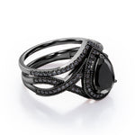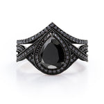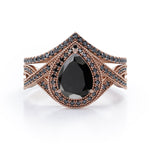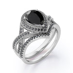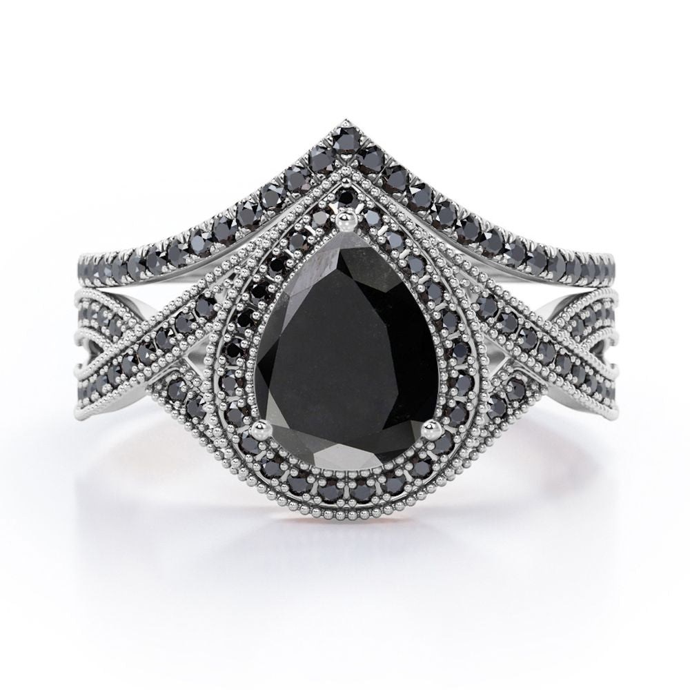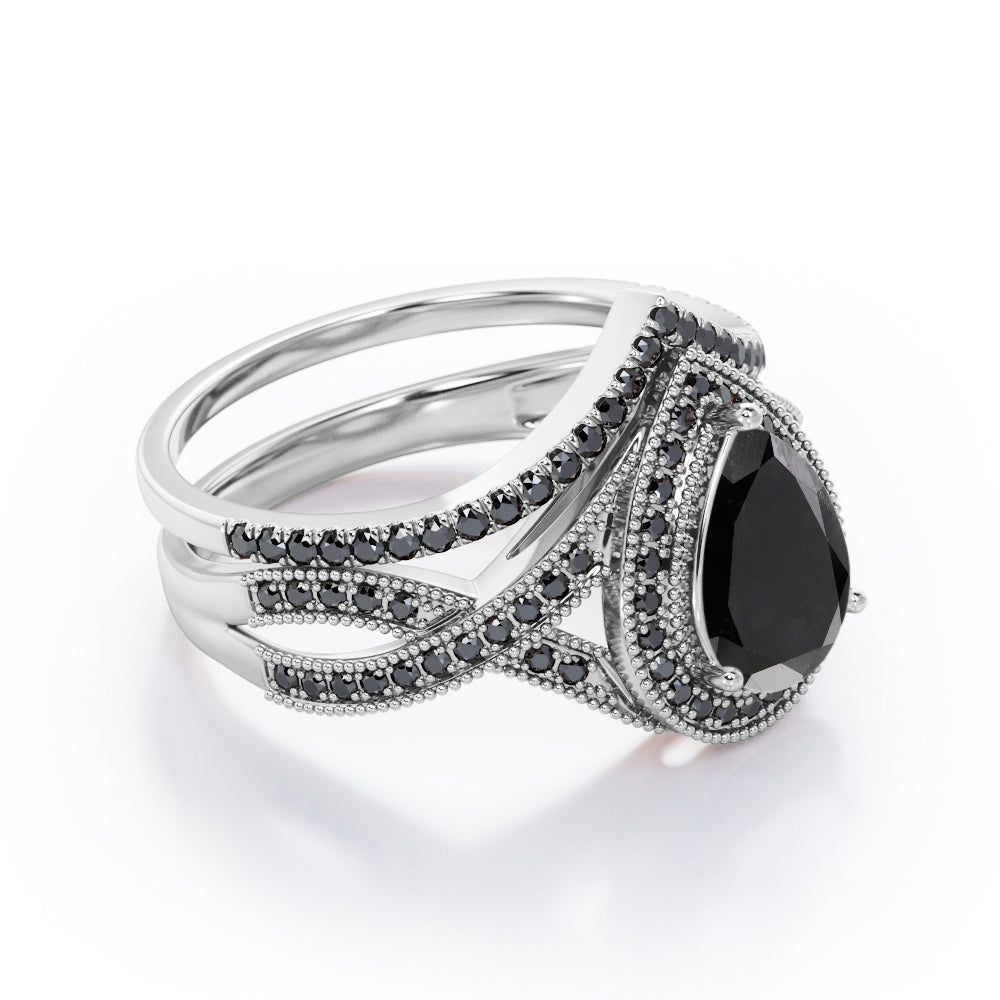 Paint your love story with this Milgrain Halo-Style 1.75 TCW Pear Cut Lab Created Black Diamond Pave Channel Wedding Ring Set in White Gold. Skillfully hand-cut into a nice pear cut by our experts in lapidary, this appealing black diamond gemstone ring set consists of total 1.75 carat lab created black diamond on solid white gold. Distinctive and extraordinary, this black diamond ring set is perfect for those who would love to express their charisma and uniqueness. With its enchanting color, this black diamond anniversary band set will unquestionably be an essential additional to any jewelry collection. This black diamond jewelry is beautiful and accessible since it is available at a reasonable price. For those who have no idea what to surprise your life partners, this black diamond anniversary band set can be a perfect gift for any occasion like engagements, Valentine's day, mother's day or anniversary. Additionally, this black diamond jewelry can be customized to your own choice of metal colors: white gold, rose gold, yellow gold or black gold in 10k and 14k gold metal options. Let's fulfill your love story with this black diamond band set and, surely, she will not regret it.
