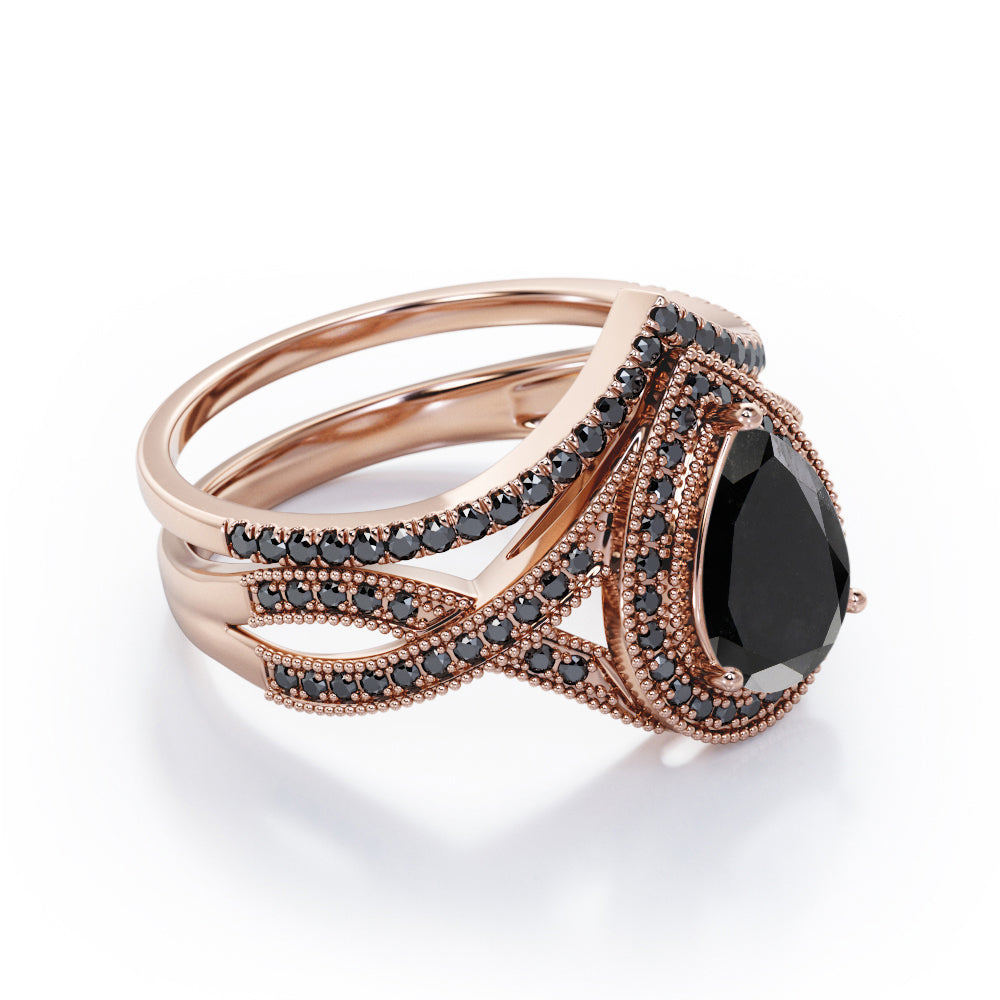 1.75 ct Pear Lab Black Diamond Milgrain Halo Wedding Ring Set