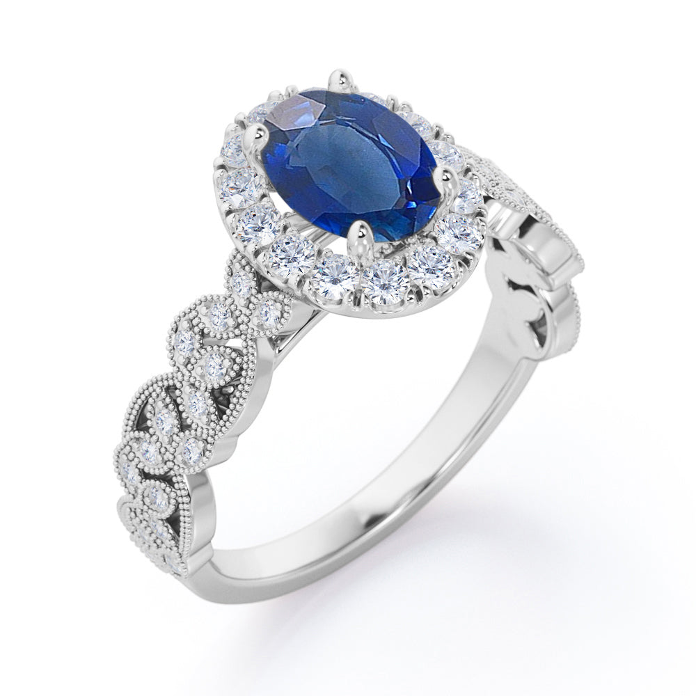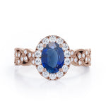 Feature a vintage ring on your hand with style. A Milgrain Leaf 0.9 carat Oval Blue Sapphire and Diamonds Nature-Inspired Engagement Ring in Rose Gold is full of intricate design. It can be a perfect choice for a proposal ring, anniversary ring or a special gift in a special event. The ring features a 0.5 carat Oval Blue Sapphire with round diamonds as the halo and the band showcases a floral pattern; round petite diamonds is placed inside marquise shape that is bordered by Milgrain. Each petal is placed in different angles and formed into a vintage flowers. The promise ring can be made in 18k gold over silver, 10k gold and 14k gold with the color of white gold, rose gold, yellow gold and black gold.