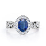 Milgrain Leaf 0.9 carat Oval Blue Sapphire and Diamonds Nature-Inspired Engagement Ring in White Gold