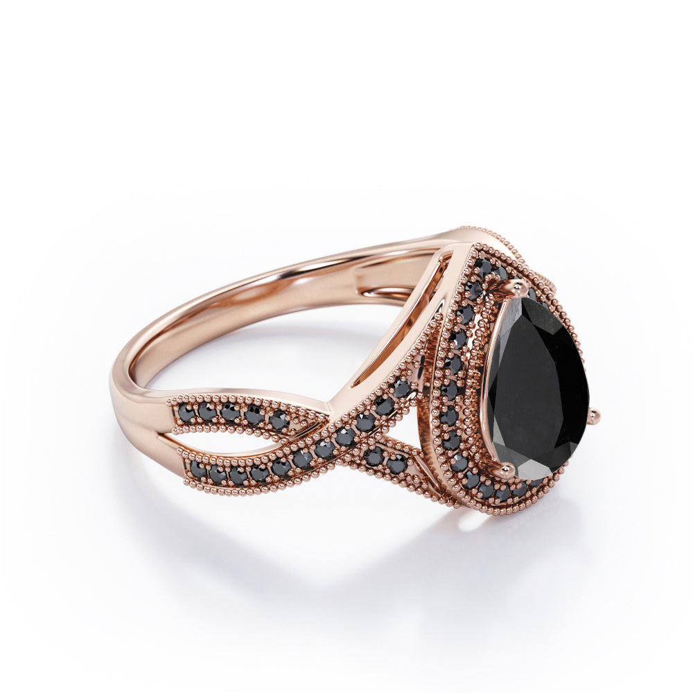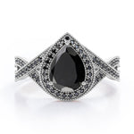 Create a magical moment with this Milgrain Pave Channel - 1.5 TCW Teardrop Lab Created Black Diamond - Halo Design Engagement Ring in White Gold. Professionally handcrafted into a fine pear cut by our experts in lapidary, this astounding synthetic black diamond ring comprises total 1.5 carat lab created black diamond on solid white gold. Distinctive and extraordinary, this black diamond stone engagement ring is perfect for those who would love to express their charisma and uniqueness. With its enchanting color, this black diamond stone ring will unquestionably be an essential additional to any jewelry collection. This black diamond promise ring is beautiful and accessible since it is available at an affordable price. For those who have no idea what to surprise your life partners, this black diamond anniversary band can be a perfect gift for any occasion like engagements, Valentine's day, mother's day or anniversary. This black diamond jewelry can be customized, so customers can choose one of metal colors between white gold, rose gold, yellow gold or black gold in 10k and 14k gold metal options. Let’s impress her with this black diamond jewelry and, surely, she will not regret it.