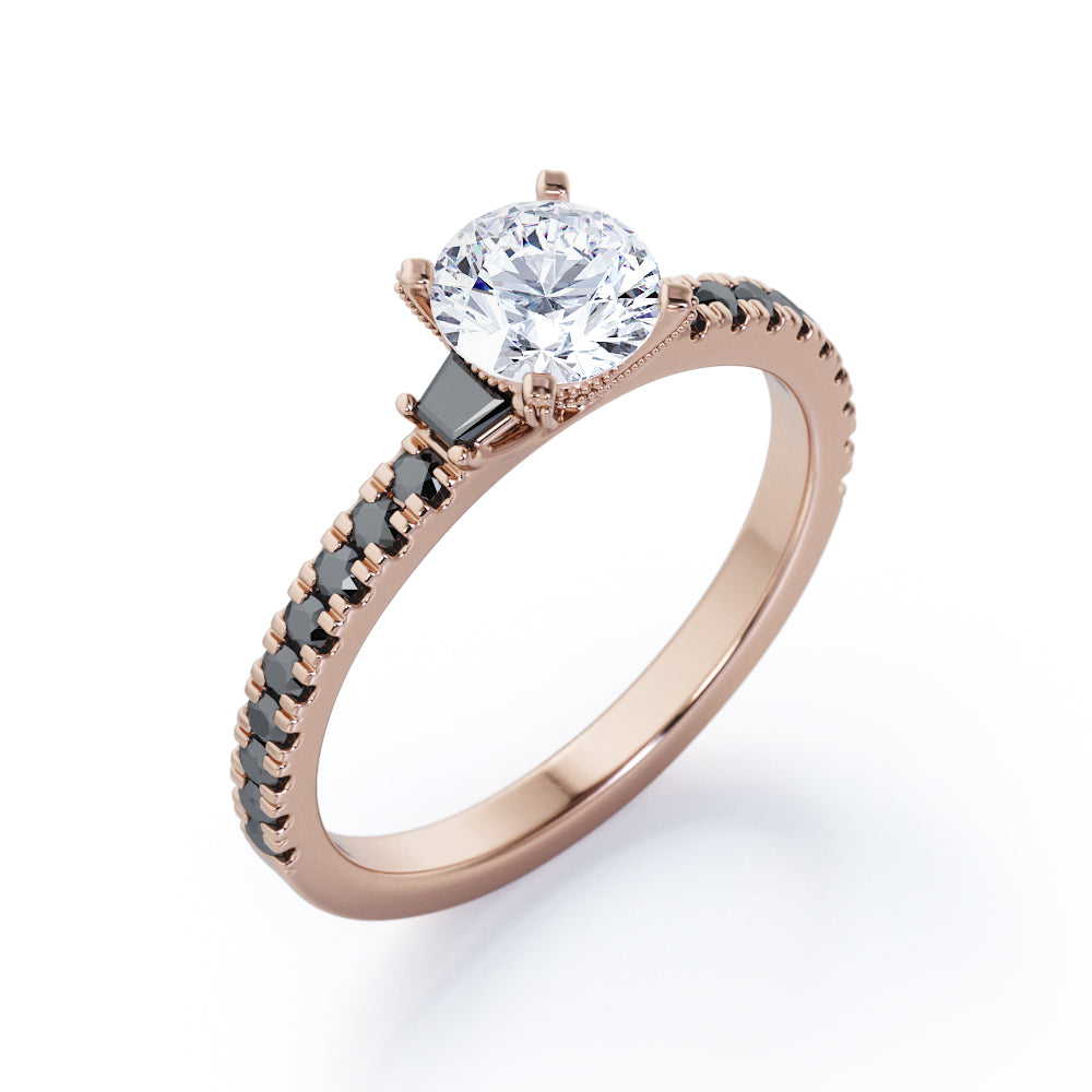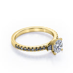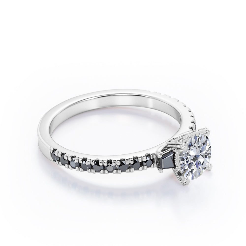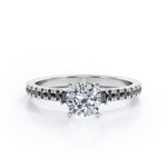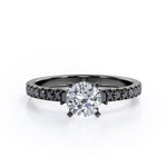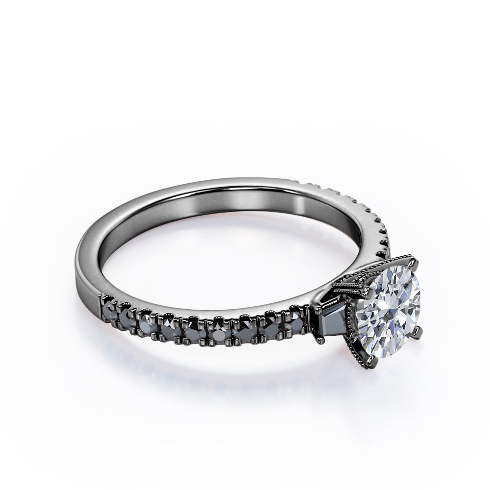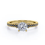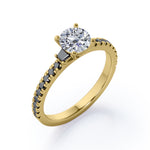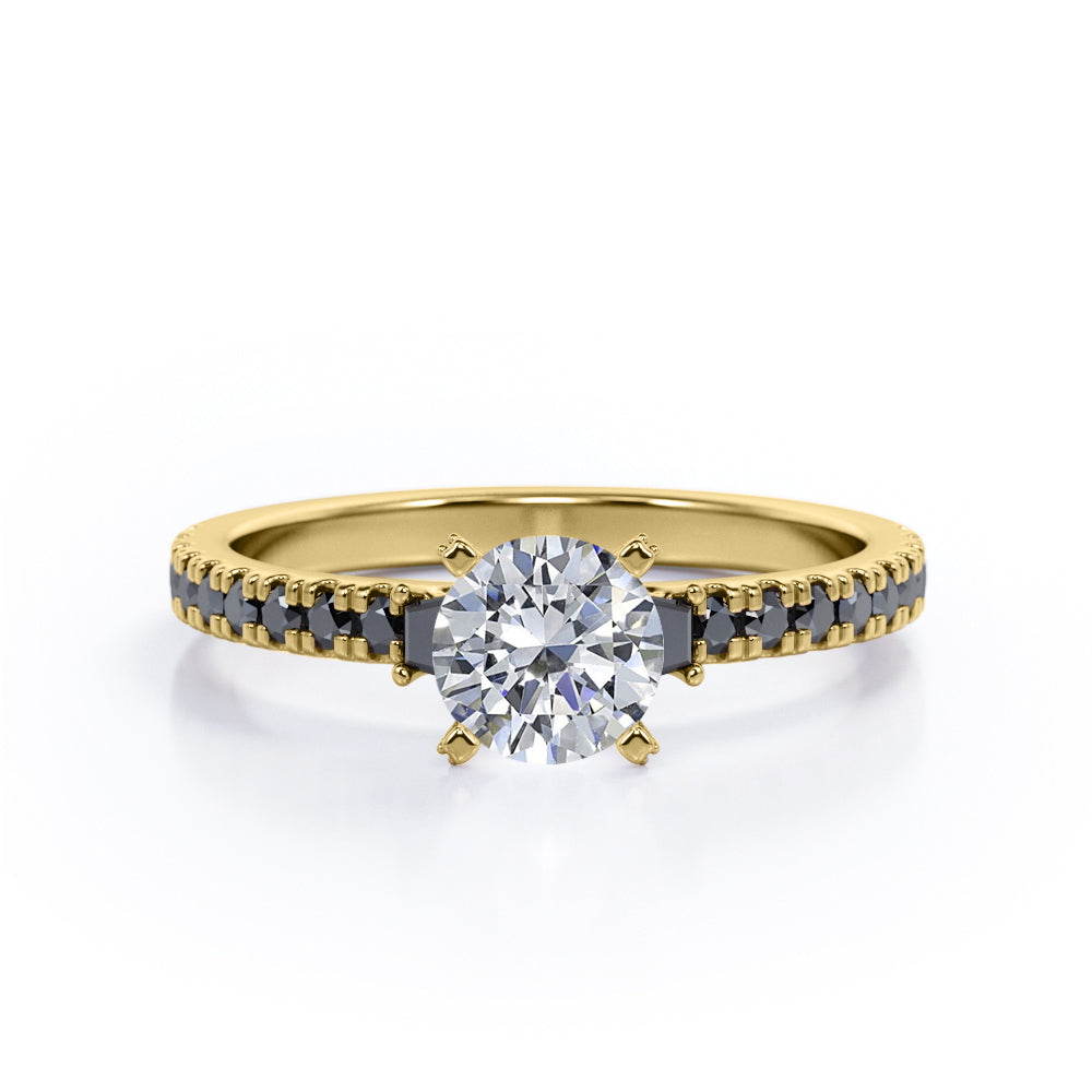 With this Milgrain Prong Cathedral - 1.3 TCW Round Brilliant Cut Moissanite with Lab Created Black diamond - Pave Engagement Ring in Yellow Gold, your significant other will be on cloud nine all the time. Hand-cut with deftness into a lovely shape round cut by our most talented jewelers, this elegant Moissanite wedding ring features total 1.3 carat Moissanite with lab-created Black diamond side stones on solid white gold. For those looking for something a little out of the ordinary, this gold band with Moissanites is ideal for those who wish to express their charisma and uniqueness. with its dazzling beauty, this Moissanite wedding ring for women will accentuate any outfit the wearer chooses to put on. This Moissanite band is a great choice for any woman's jewelry collection. This wedding anniversary ring is a great option if you are in search for something truly special to give to your special someone. This Moissanite ring can be customized, so customers can choose one of metal colors between White gold, rose gold, yellow gold, and black gold in 18k gold over silver, 10k and 14k gold metal options. Your love story will be complete with this affordable Moissanite engagement ring.