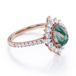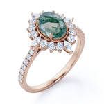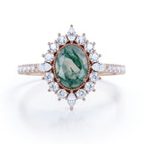 Milgrain Vintage Halo 0.8 carat Oval Moss Agate and Moissanite Anniversary Ring in White Gold