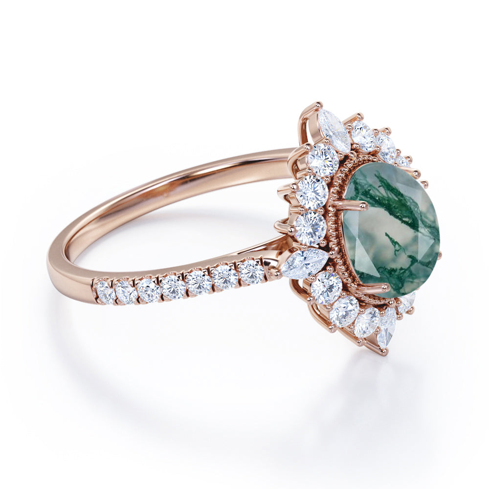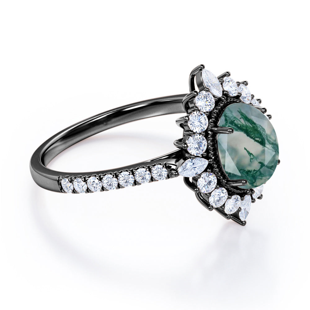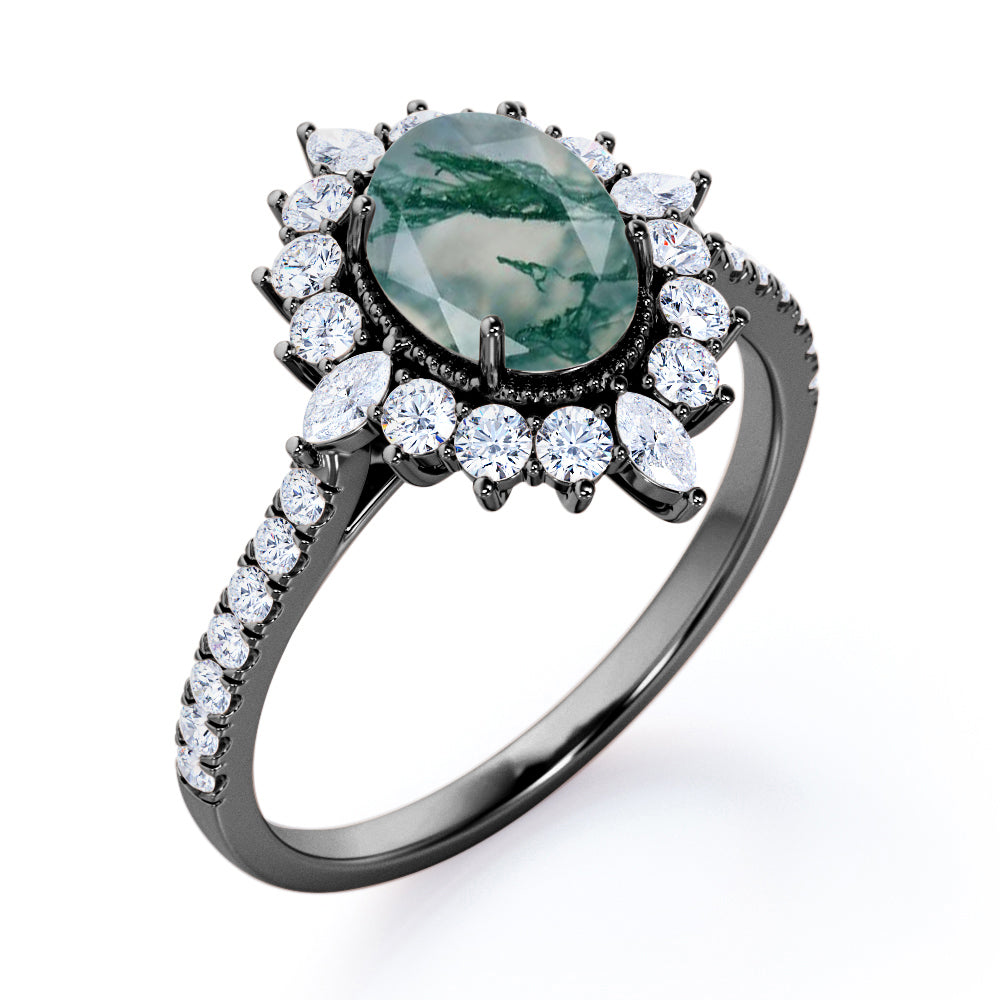 The Milgrain Vintage Halo 0.8 carat Moss Agate and Moissanite Anniversary Ring in White Gold. The ring displays a 0.5 carat oval natural moss agate stone that is encompassed by Milgrain and Moissanite accent; it is composed by 4 marquise Moissanite that are placed in 4 directions and connected each marquise by small round Moissanite stones. The band is embellished by paved Moissanite and the sparkle compliments the center piece. White gold, rose gold, yellow gold or black gold can be selected as your band color and the metal can be either 18k gold over silver, 10k gold or 14k gold.