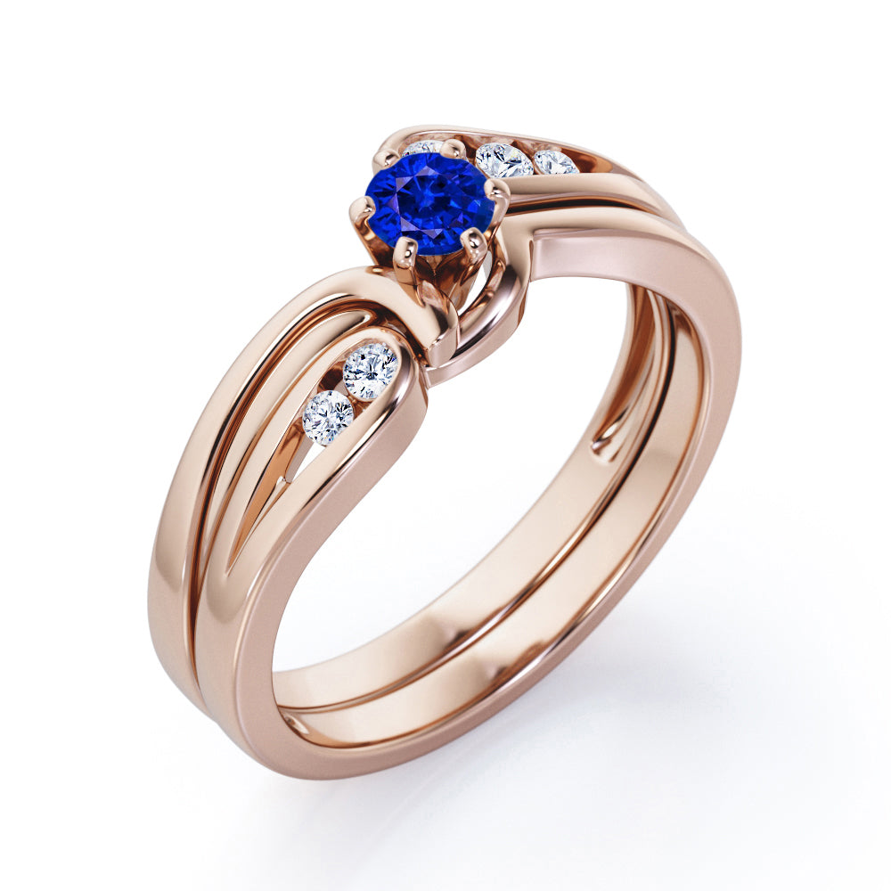 Add more style to your everyday wear with a Mini Channel Design 0.5 TCW Round Cut Moissanite and Diamond Six-Prong Bridal Ring Set in White Gold. The engagement ring features a 0.5 cart round Blue Sapphire that is held by six prongs and curved band at the sides. One side of the engagement ring band is adorned by three different size of Moissanite for silver ring(18k gold over silver) and diamonds for gold ring. Even though the promise ring only sparkles on only one side but once you wear it with the u-curved band, the ring will have stones on two sides of them. The wedding band carries the almost same design with the engagement ring and matches with each other perfectly. You can choose either 18k gold over silver, 10k gold or 14k gold to ne your metal and there are 4 color options for you to choose as well; white gold, rose gold, yellow gold and black gold.
