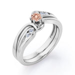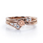 Add more style to your everyday wear with a Mini Channel Design 0.5 TCW Round Cut Moissanite and Diamond Six-Prong Bridal Ring Set in Rose Gold. The engagement ring features a 0.5 cart round Morganite that is held by six prongs and curved band at the sides. One side of the engagement ring band is adorned by three different size of Moissanite for silver ring(18k gold over silver) and diamonds for gold ring. Even though the promise ring only sparkles on only one side but once you wear it with the u-curved band, the ring will have stones on two sides of them. The wedding band carries the almost same design with the engagement ring and matches with each other perfectly. You can choose either 18k gold over silver, 10k gold or 14k gold to ne your metal and there are 4 color options for you to choose as well; white gold, rose gold, yellow gold and black gold.