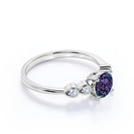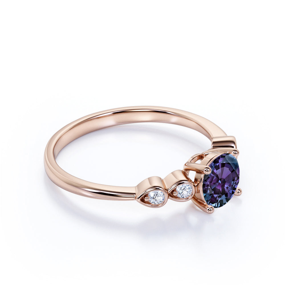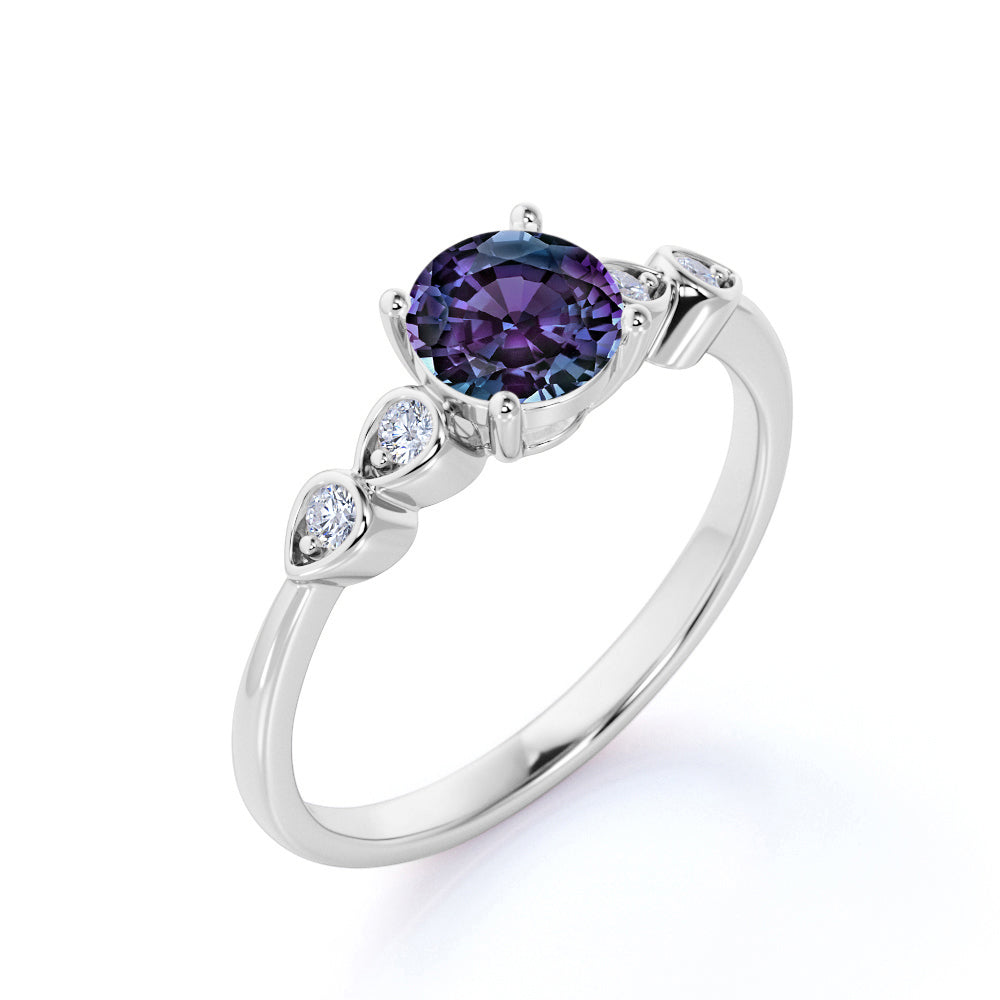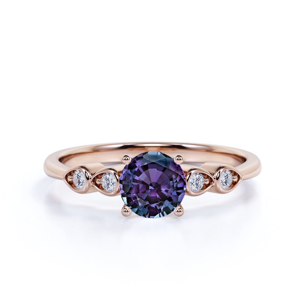 Be on cloud nine with this Minimal Prong Basket 1.15 Carat Round Cut Simulated Alexandrite and Diamond 5 Stone Engagement Ring. This lovely ring features 1 carat round cut lab grown Alexandrite and .15 carat real genuine side diamond for gold ring and moissanite for silver ring. This delicate ring can be customized to either 10k, 14K and Gold over Silver and either Black Gold, Rose Gold, White Gold or Yellow Gold. Also, as your satisfaction is our most priority, we will do our best to have your handmade jewelry be carefully and beautifully crafted by our expert jewelers. The order also comes with a 30-day full refund policy. Crowned as June birthstone, this flawless synthetic Alexandrite ring will bring hope as well as encouragement to you. Being one of the rarest gemstones in the world, this ring will create a charming and fascinating look on your fingers. This flawless ring will be a perfect fit for you love story as it is believed that joy enters the lives of people through the stone. Ornament your love story with this stunning color changing lab made Alexandrite ring inviting more happiness and joy into your marriage life. This simulated Alexandrite ring gives a vivid grass green color in daylight and displays an intense raspberry red in candescent light. Embellish your love story with this beautiful man made Alexandrite ring and make it even more memorable. This ring will bring love and hope to its wearer. Design and create your very own unique ring that makes you outstanding from the rest! Sparkle your finger with this mystic lab made Alexandrite ring which is perfect for any occasion and everyday wear. It is the perfect match for those who are looking for a remarkable gemstone rings as Alexandrite embodies their own unique color-change ability and uplifting meaning.