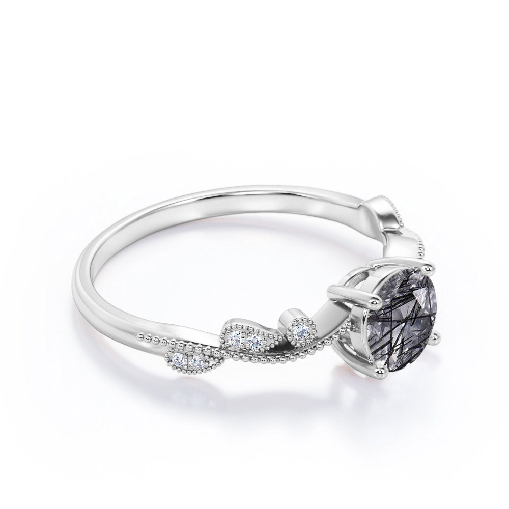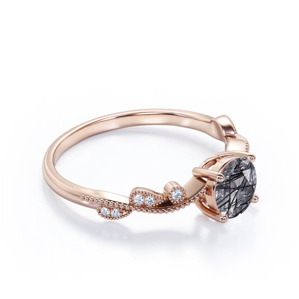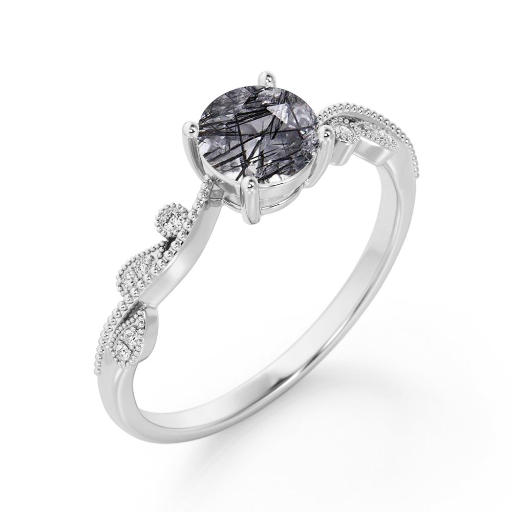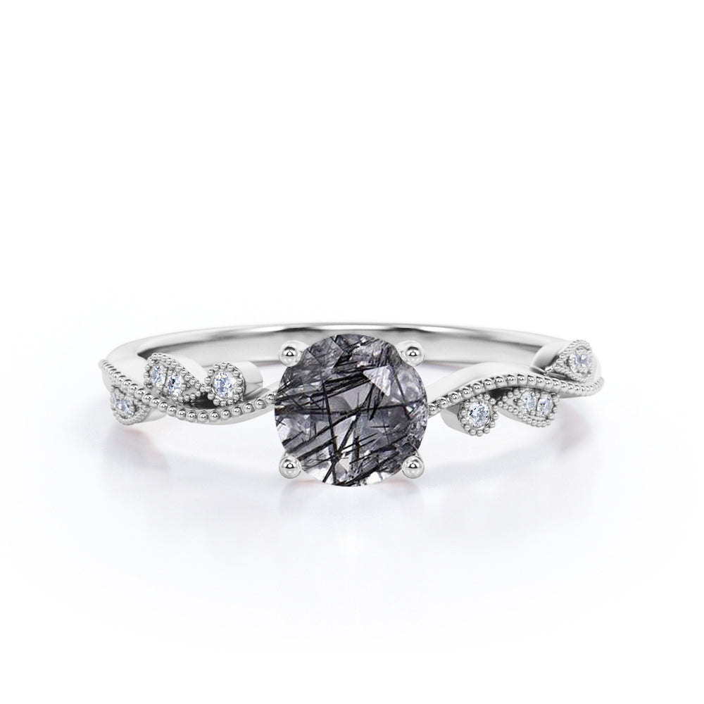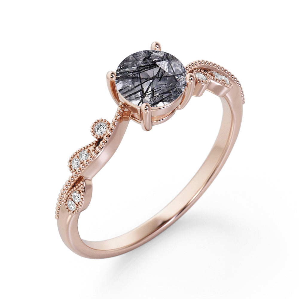 Create an incredibly beautiful look on her finger with this Minimal Solitaire 1.25 Carat Round Cut Natural Druzy Black Rutilated Quartz and Diamond Art Deco Engagement Ring. This minimalist art deco solid dendritic rutilated quartz engagement ring features 1 carat round cut real rutilated quartz and .25 carat real side diamond for gold ring and moissanite for silver ring. This simple solitaire engagement ring can be customized to either 10k, 14K and Gold over Silver and either Black Gold, Rose Gold, White Gold or Yellow Gold. Also, as your satisfaction is our most priority, we will do our best to have your handmade jewelry be carefully and beautifully crafted by our expert jewelers. The order also comes with a 30-day full refund policy. This clear crystal with black needle inclusions ring will surely be a perfect gift for your significant other. It is believed to attract a good match, increase appeal, and fascinate with your own personality. This tourmalinated black rutilated quartz is believed to be a protection against the ill thoughts of others. The unique dendritic black rutile within its clear quartz will surely complement every style of its wearer. Perfect for everyday wear, this solid rutilated quartz ring is resistant to chemical attack. This ring is available at a very affordable price and available in both silver and gold ring. Precisely handcrafted and created to be unique, no two rings are exactly alike because of its unique pattern of needle inclusions. Being considered a powerful amplifiers of thoughts, this natural rutilated quartz ring offers connection to the Divine mind and receipt of Divine inspiration. Impress your special someone with this beautiful and affordable natural black hair rutilated quartz ring. It is the perfect match for those who are looking for a remarkable gemstone rings as rutilated quartz embodies their own unique intriguing patterns and uplifting meaning.