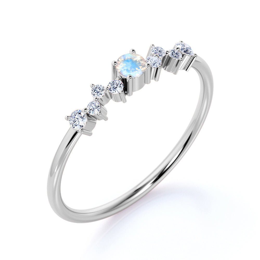 Minimalist 0.35 Carat Round Shaped Blue Moonstone and Antique Diamond Engagement Ring in White Gold