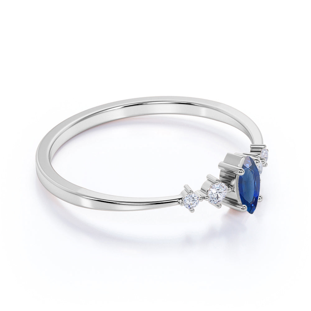 This tiny corn blue sapphire ring is very cool and comfortable, it is also great for daily wear or even a proposal ring for her. The wait is over for those women who are tired of those crazy details which is not necessary for your engagement ring, this minimal blue sapphire ring is the best for you. This small blue sapphire ring features an approximately .35 carat marquise cut authentic blue sapphire, surrounded by .14 carat natural diamond accent, for a total weight of 0.49 carats.