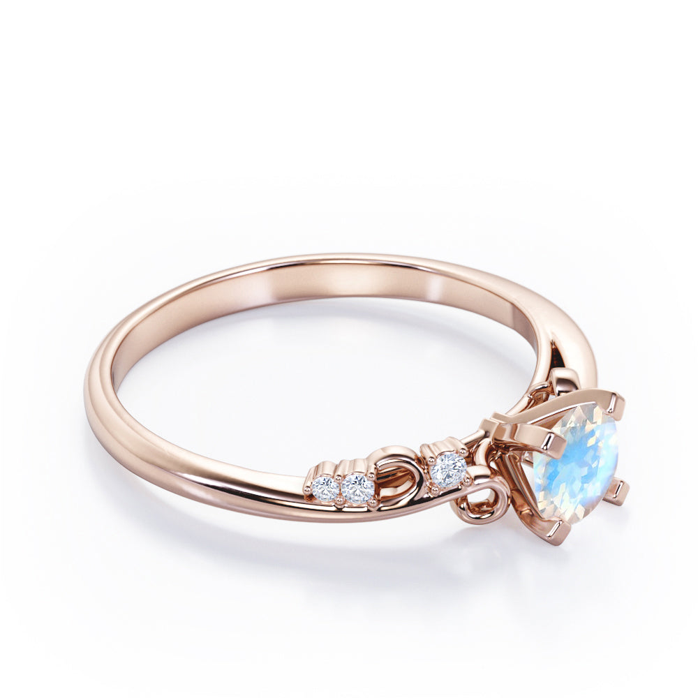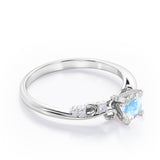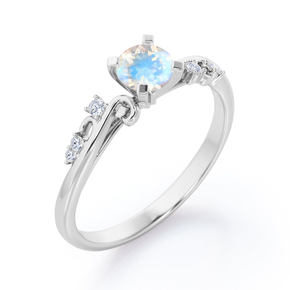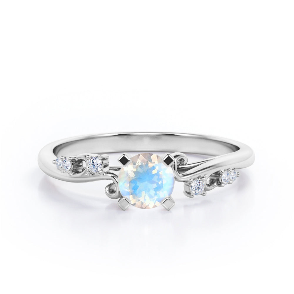 Minimalist 1.05 Carat Round Cut Moonstone And Diamond Seven Stone Engagement Ring In White Gold. Effortless and elegant, this is a piece you're bound to love forever. A captivating round shaped moonstone of 1 carat is accompanied by six dainty round shaped 0.05 carat diamonds on either side in a plain White gold band. This round shaped moonstone held in a classic four prong setting radiates simple elegance. The swirling design on the band is something very unique which adds more value to this moonstone and diamond engagement ring. This seven stone ring can also be an ideal seven years anniversary gift for your loved ones. This minimalist 1.05 carat round cut moonstone and diamond seven stone engagement ring in white gold can also be customized to 18k Gold plating over silver, 10k Gold or 14k Gold as per your preference. So, wait no more, just make this statement piece the symbol of your love by clicking the add to cart button below. Please note that if the ring is made over silver, the side stone will be moissanite and if it is made on gold, diamond will be employed as the side stone.
