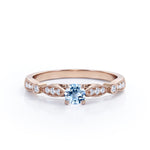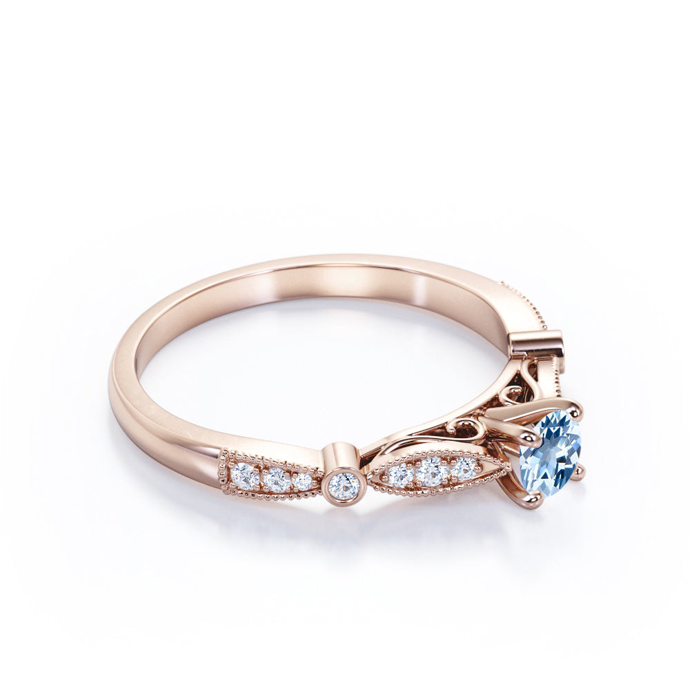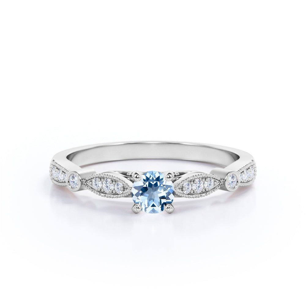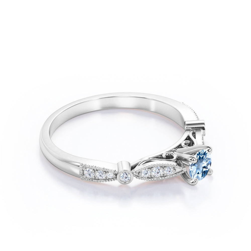Minimalist 1.10 Carat Round Cut Aquamarine And Diamond Vintage Engagement Ring In White Gold. Make your mark in her heart with this adorable promise ring. The ring highlights a dazzling blue aquamarine center stone set in a prong setting securely holding the stone in place while maintaining brilliance while paved diamonds are settled in the band adding minimal brilliance to the ring. The ring also features intricate milgrain detailing along the band beautifully handcrafted by our talented and experienced jewelers. Handcrafted with passion, this minimalist promise ring is made with 1 carat very fine round aquamarine center stone, surrounded by 0.1 carat dazzling diamond side stones for the gold rings and moissanite for the silver rings that weigh a total of 1.10 carat. This lovely ring would also be a great option for your everyday wear as it would surely match any outfit. Adorable in white gold, this vintage engagement ring is also available in rose gold, yellow gold, and black gold. Also, it can be made between 18k gold over silver, 10k gold, and 14k gold depending on your preferred customization. Please kindly note for the silver ring option that silver is a very sensitive metal, any chemicals like hand creams, lotion, or sanitizers. etc., can affect the plating.