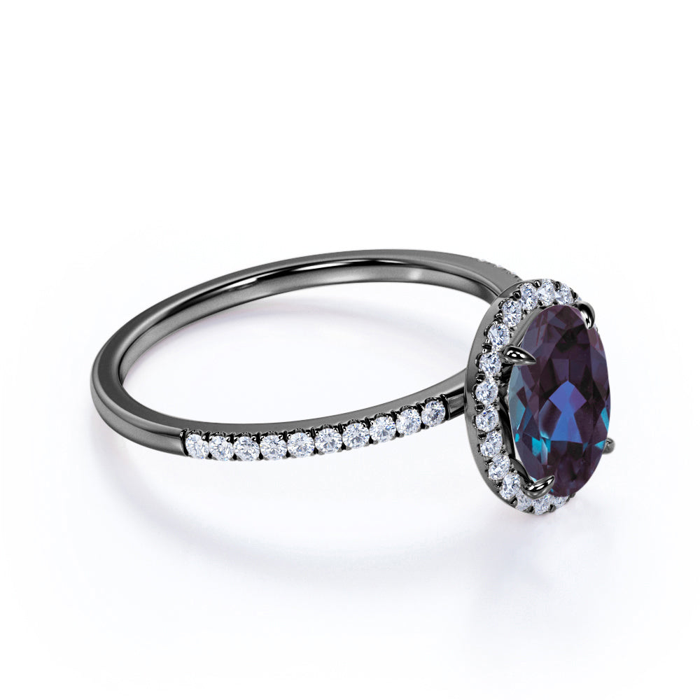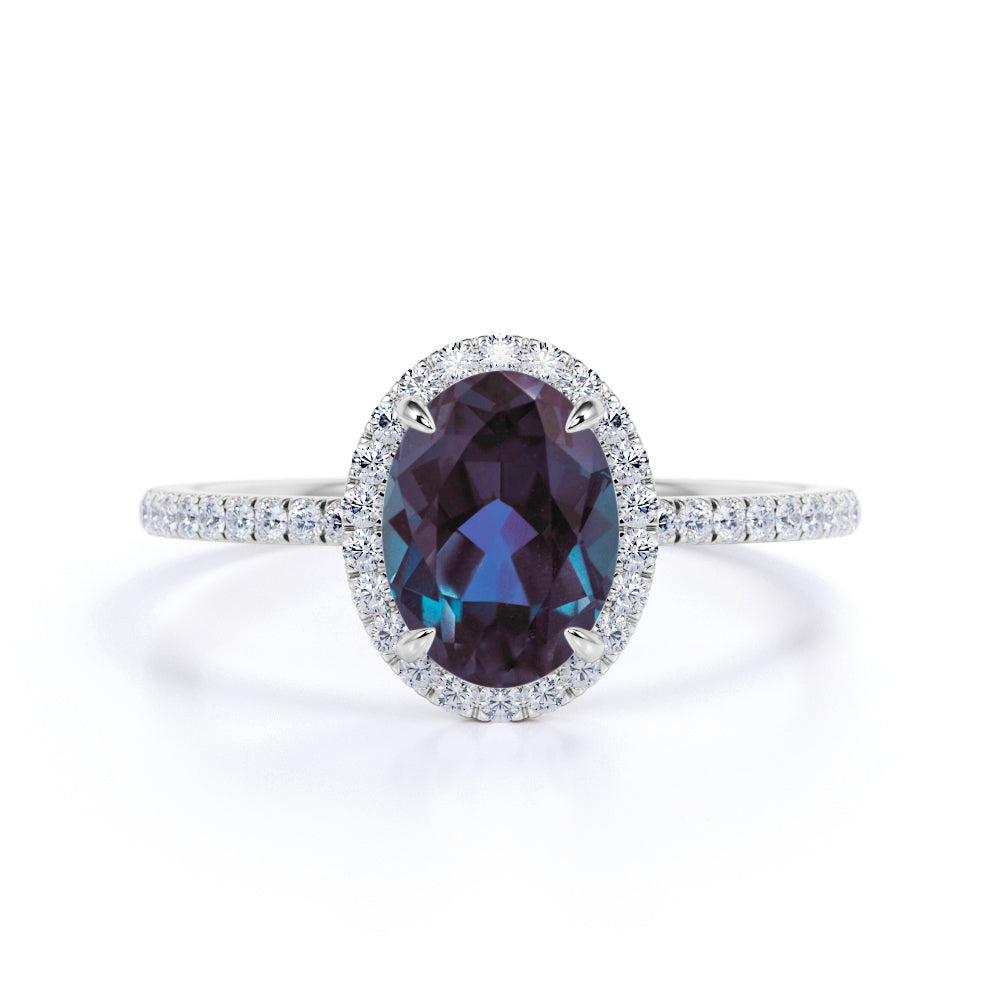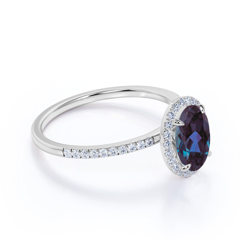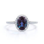Minimalist 1.50 Carat Oval Cut Lab Made Alexandrite and Diamond Halo Pave Engagement Ring