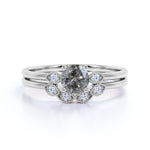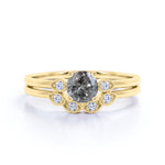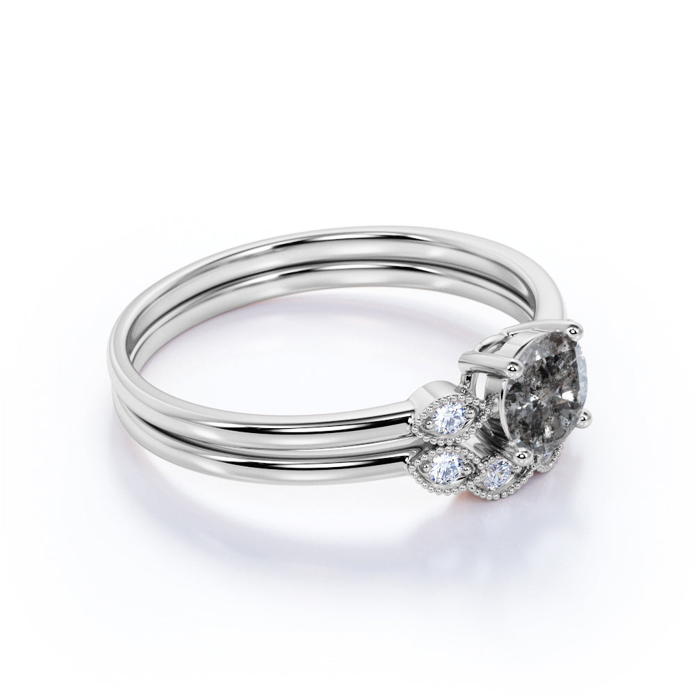 IMPORTANT NOTE: Since each Salt and Pepper Diamonds is one of a kind, the actual color of it may vary from the one that is pictured above. With its quirky inclusions, this Minimalist 3 Stone 0.75 Carat Round Cut Icy Dark Grey Salt and Pepper Diamond and Curved Art Deco Band Wedding Ring Sets will surely make you stand out from others. This three stone ring features .50 carat round cut natural Salt and Pepper Diamond and .25 carat real side Diamond for gold ring and Moissanite for silver ring. This lovely bridal set rings can be customized to either 10k, 14K and Gold over Silver and either Black Gold, Rose Gold, White Gold or Yellow Gold. Also, as your satisfaction is our most priority, we will do our best to have your handmade jewelry be carefully and beautifully crafted by our expert jewelers. The order also comes with a 30-day full refund policy. Due to its unique appearance, this ring will be a distinctive gift for all special occasions. With its unique appearance, you can be sure that no any other rings will look exactly alike. If you are searching for some alternate gemstone with unique appearance, this Salt and Pepper Diamond ring will be your right choice. It is eco-friendly, ethical, and environmental friendly. Being considered a very eccentric gemstone, this ring will create a timeless and fabulous engagement ring. Create a fascinating look on your finger with this Salt and Pepper Diamond ring for women which is available in both solid gold and sterling silver. Sparkle your finger with this ring which is perfect for any occasion and everyday wear. Its inclusions reminds us that beauty doesn't always lie in perfection. With its mesmerizing salt and pepper inclusions, it is sure to enchant your special someone with gracefulness.