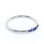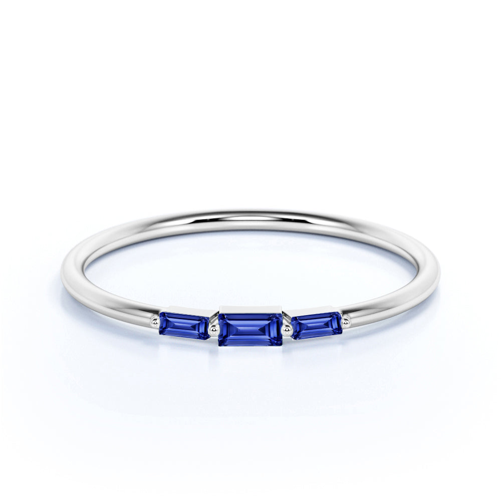 Minimalist 3 Stone Baguette Cut Cornflower Blue Sapphire and Shared Prong Stackable Ring Band in White Gold