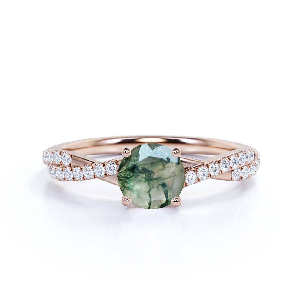 Paint your love story with this Minimalist Prong Solitaire 1.25 Carat Round Cut Natural Dendritic Moss Green Agate and Diamond Infinity Pave Engagement Ring in Rose Gold for Women. This solitaire milky white moss green Agate engagement ring features 1 carat round cut real moss green agate and .25 carat real side diamond for gold ring and moissanite for silver ring. This minimalist twist engagement ring can be customized to either 10k, 14K and Gold over Silver and either Black Gold, Rose Gold, White Gold or Yellow Gold. Also, as your satisfaction is our most priority, we will do our best to have your handmade jewelry be carefully and beautifully crafted by our expert jewelers. The order also comes with a 30-day full refund policy. This green colored minerals with banded inclusions ring will surely be a perfect gift for your special someone. It is well-known for spiritual and healing power. Encourage trust and hope with this real green Agate ring that shows a variety of white with green inclusions that resembles moss. Due to its unique milky white color with green dendritic inclusions, this vintage moss green Agate ring is sure to enchant its wearer. With its long history and many oral traditions around the world, this delicate druzy moss green Agate ring is sure to be eye-catching and bring all eyes on you. It can be customized as per your satisfaction and available in both silver and gold metal. With its moss-like inclusions, this ring will make you shine and stand out from others. Being considered a very lucky omen, this natural banded moss green Agate ring encourages the gradual growth of what you currently need most in your life. Those who has a penchant for vintage and flawless ring would completely fall in love with this ring. It is the perfect match for those who are looking for a remarkable gemstone rings as moss green Agate embodies their own unique intriguing patterns and uplifting meaning.