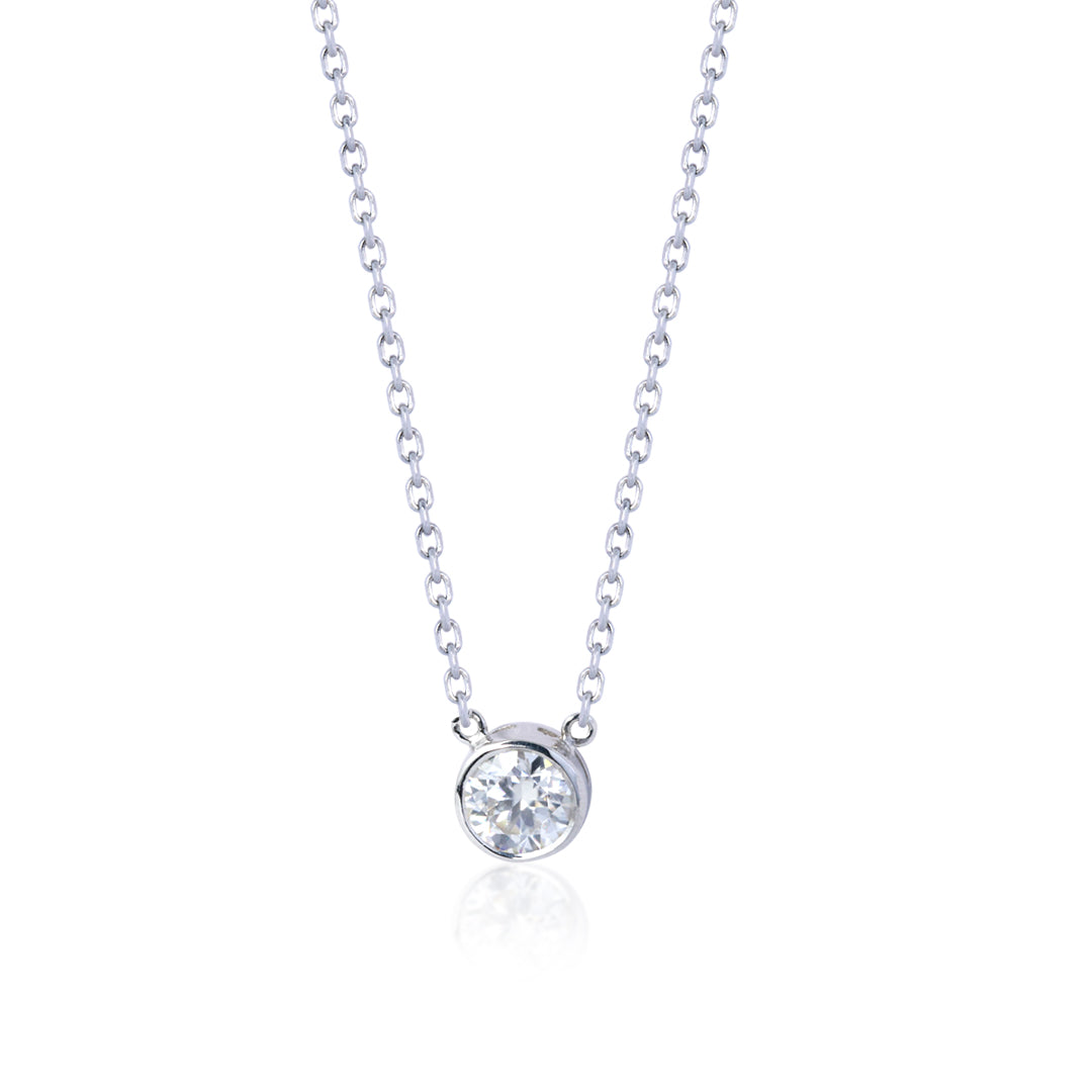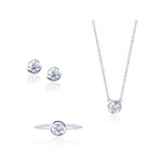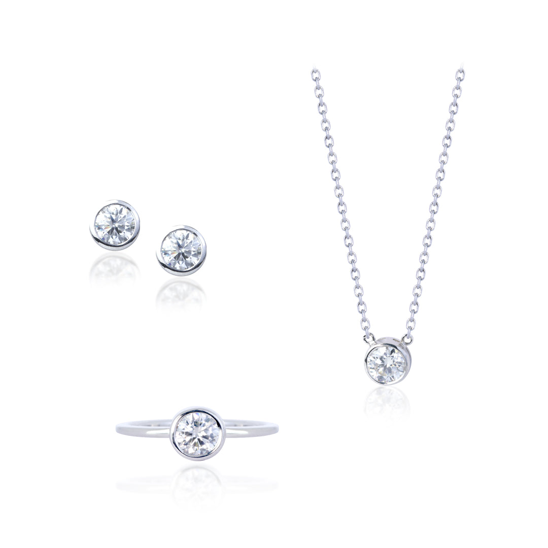 Create a magical moment with this Minimalist Solitaire Bezel Jewelry Gift Set of 1.70 TCW Moissanite with Ring, Earrings & Pendant. Skillfully hand-cut into a nice round cut by our experts in lapidary, this astonishing silver moissanite jewelry set features total 1.70 carat moissanites on solid white gold plating over silver. Distinctive and extraordinary, this valentines jewelry set is perfect for those who would love to express their charisma and uniqueness. With naked eyes moissanites look, shine and feel exactly like diamonds. With its splendor, this moissanite jewelry set will absolutely enhance every style of its wearer. This bridal jewelry set is beautiful and accessible since it is available at an affordable price. Moissanites are the most popular alternative gemstone for diamonds while being at lower and more affordable price. Considered as a symbol of timeless love and affection for your lover, this valentine's day jewelry set for wedding can be a perfect gift for any occasion like engagements, Valentine's day, mother's day or anniversary. In regards to its hardness, moissanite is almost as hard as diamond which means that it is notably durable. Let's fulfill your love story with this silver jewelry set, and she will be eternally joyful.