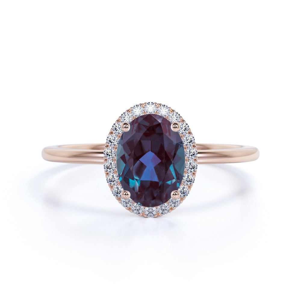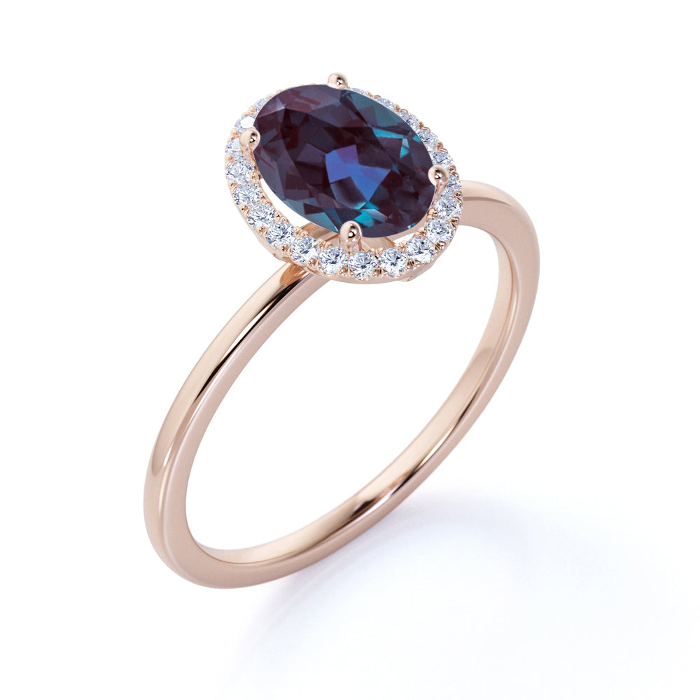 Minimalist Under Halo 1.25 Carat Oval Cut Synthetic Alexandrite and Diamond Plain Shank Engagement Ring