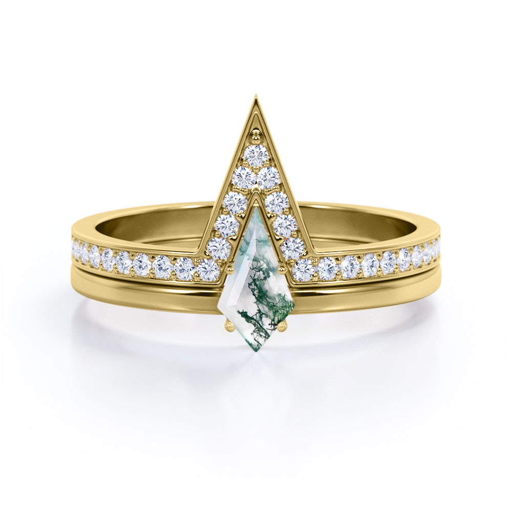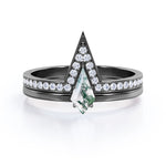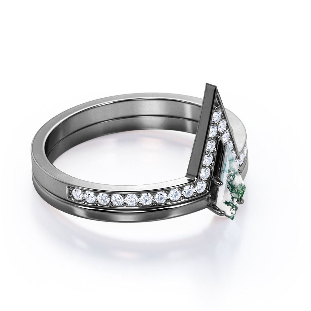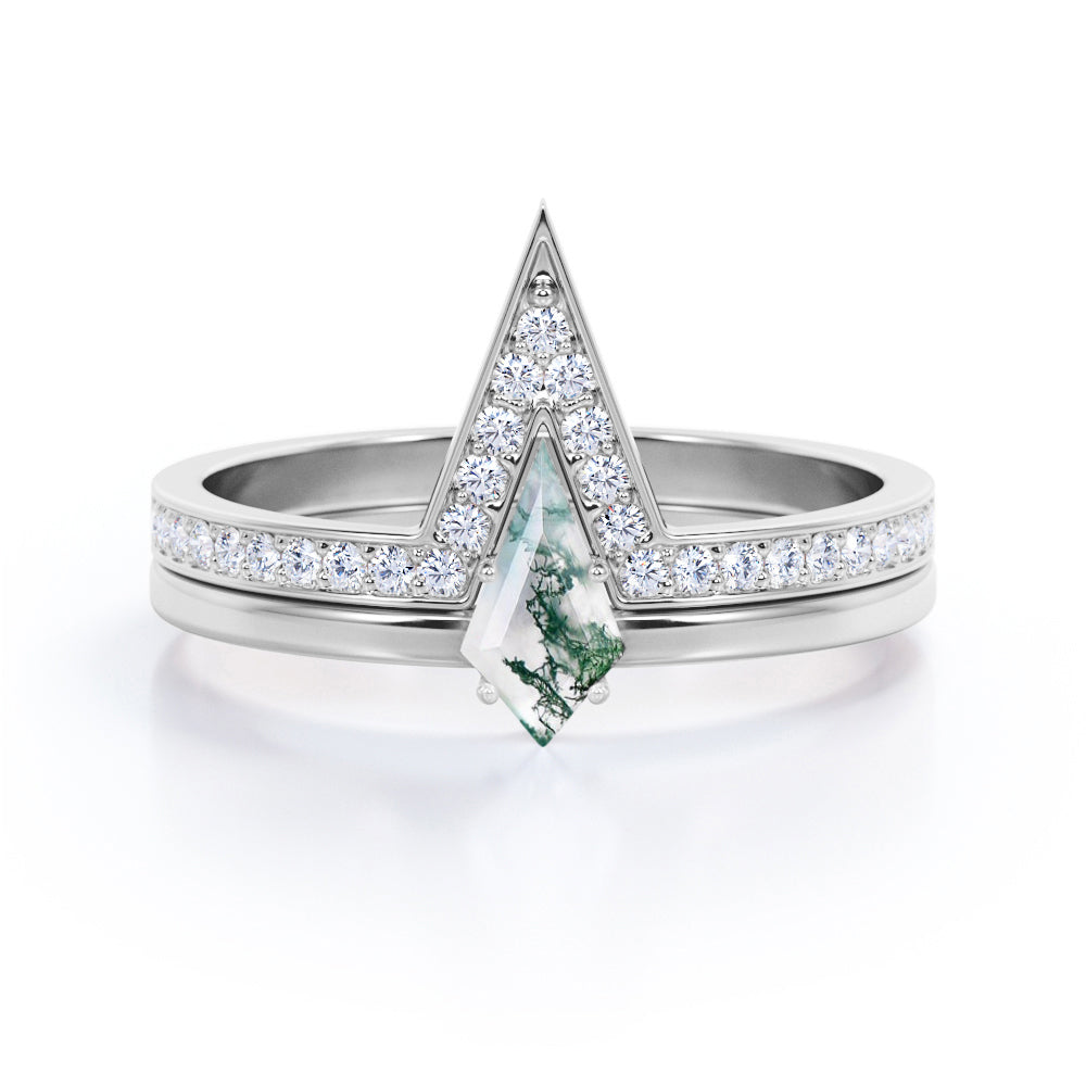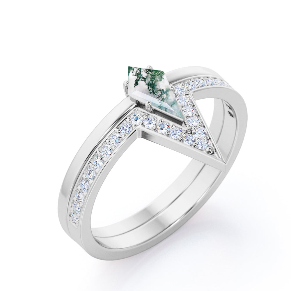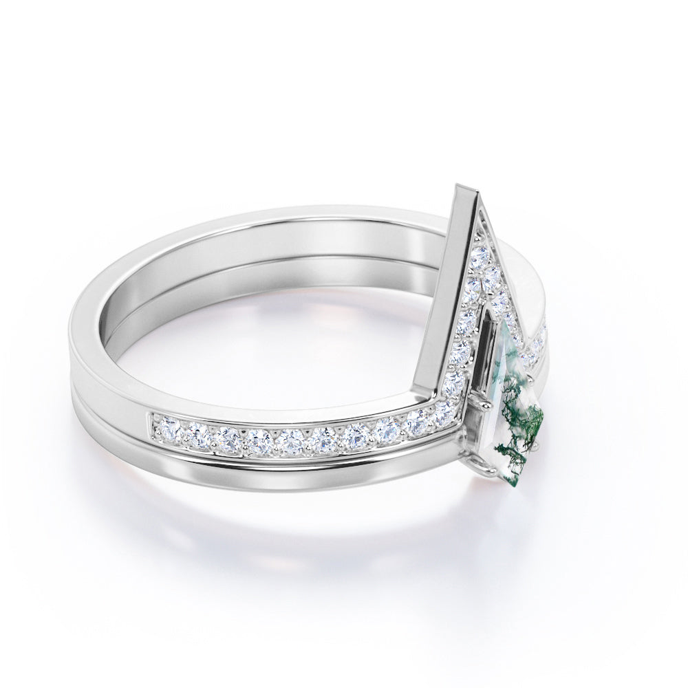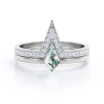 Modern 0.75 carat Kite Shaped Moss Agate and Moissanite Bridal Ring Set in White Gold