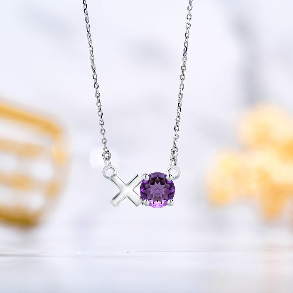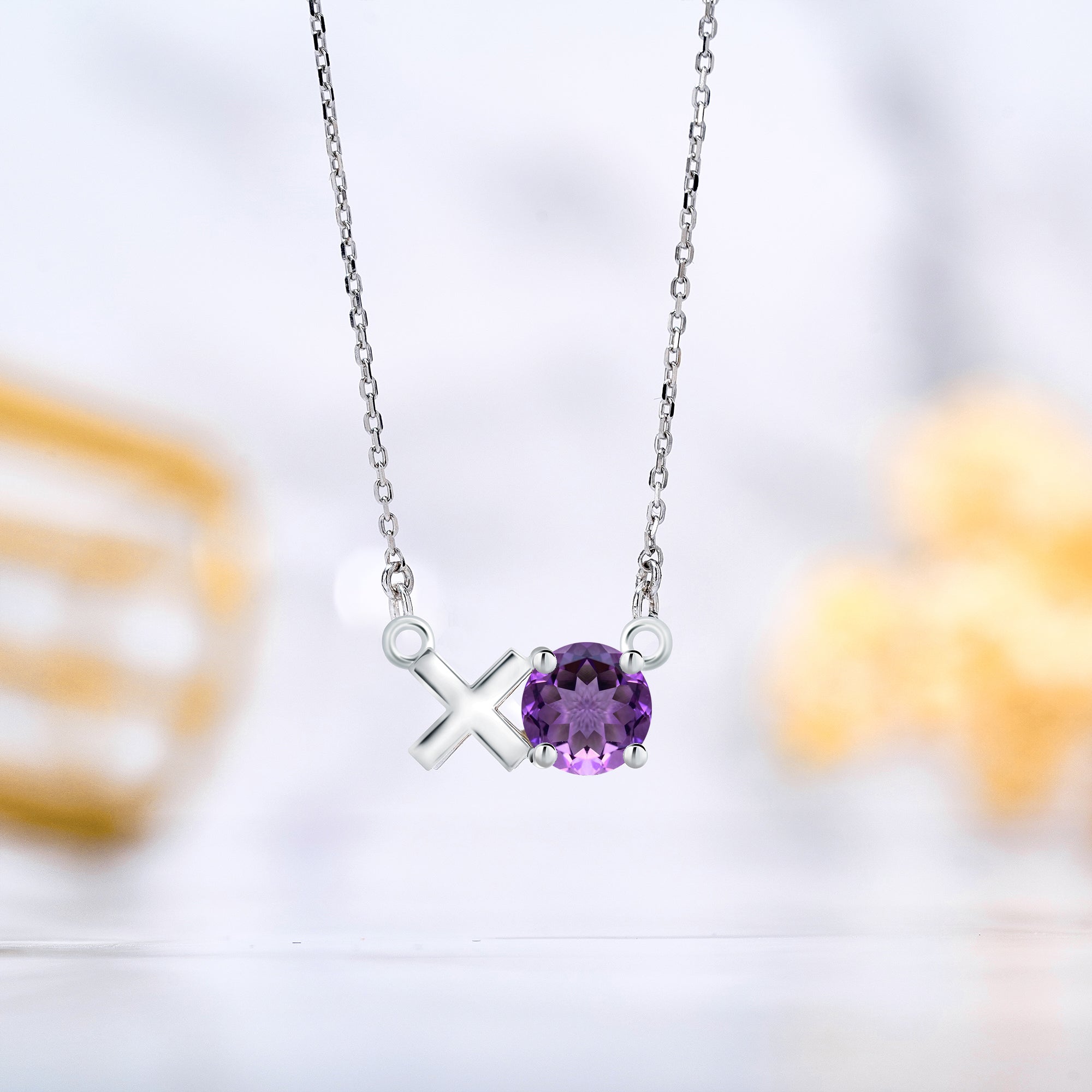 Modern 1.25 TCW Round Cut - Amethyst - February Birthstone Floating XO Pendant Necklace in 18K White Gold over Silver