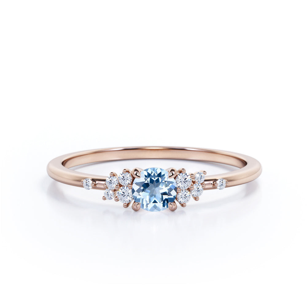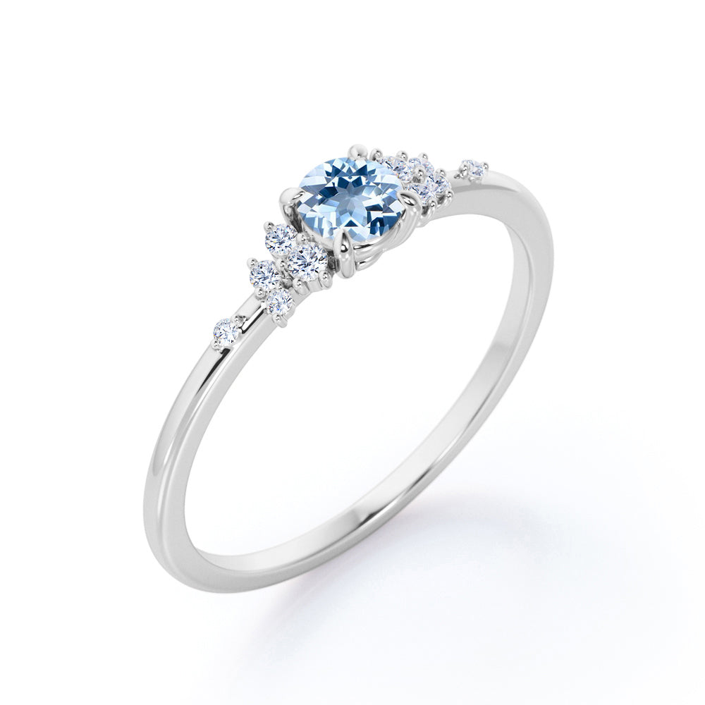 Modern 4 Prong 1.25 Carat Round Cut Genuine Vivid Blue Aquamarine and Diamond Cluster Engagement Ring