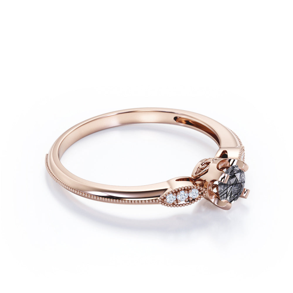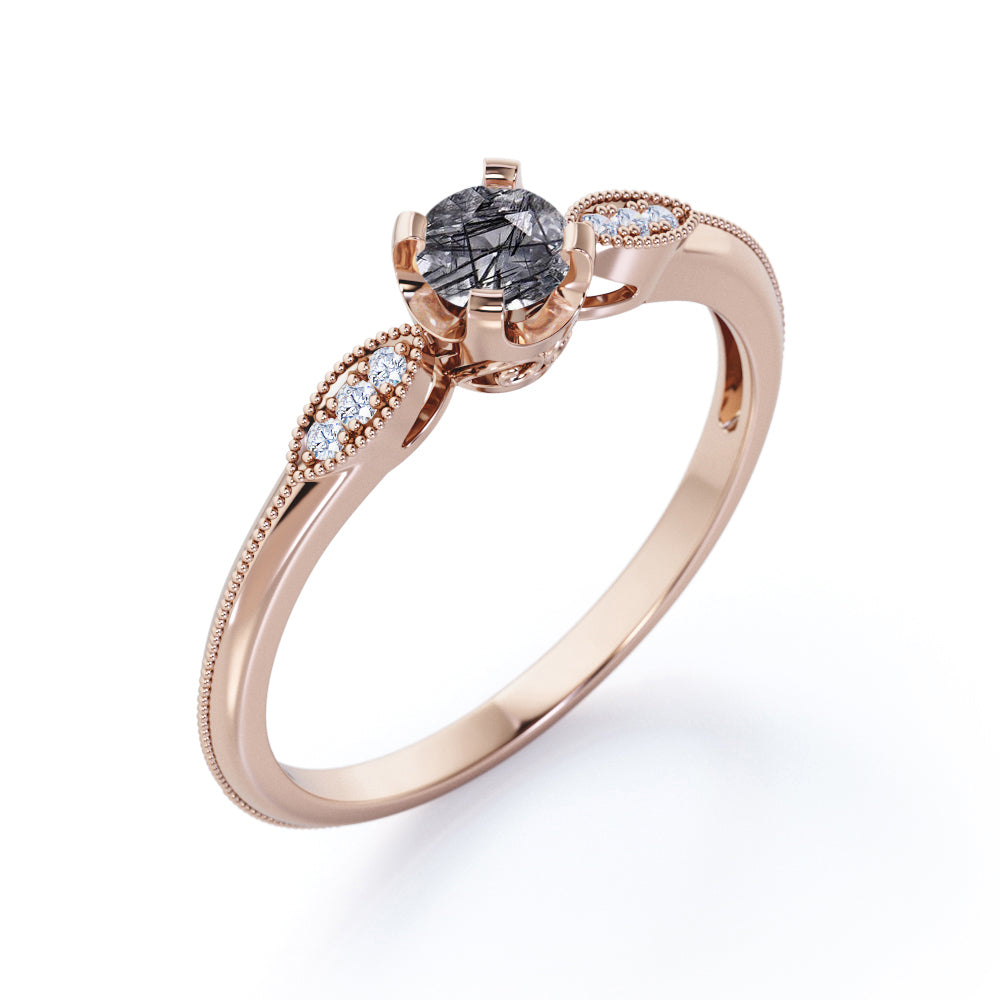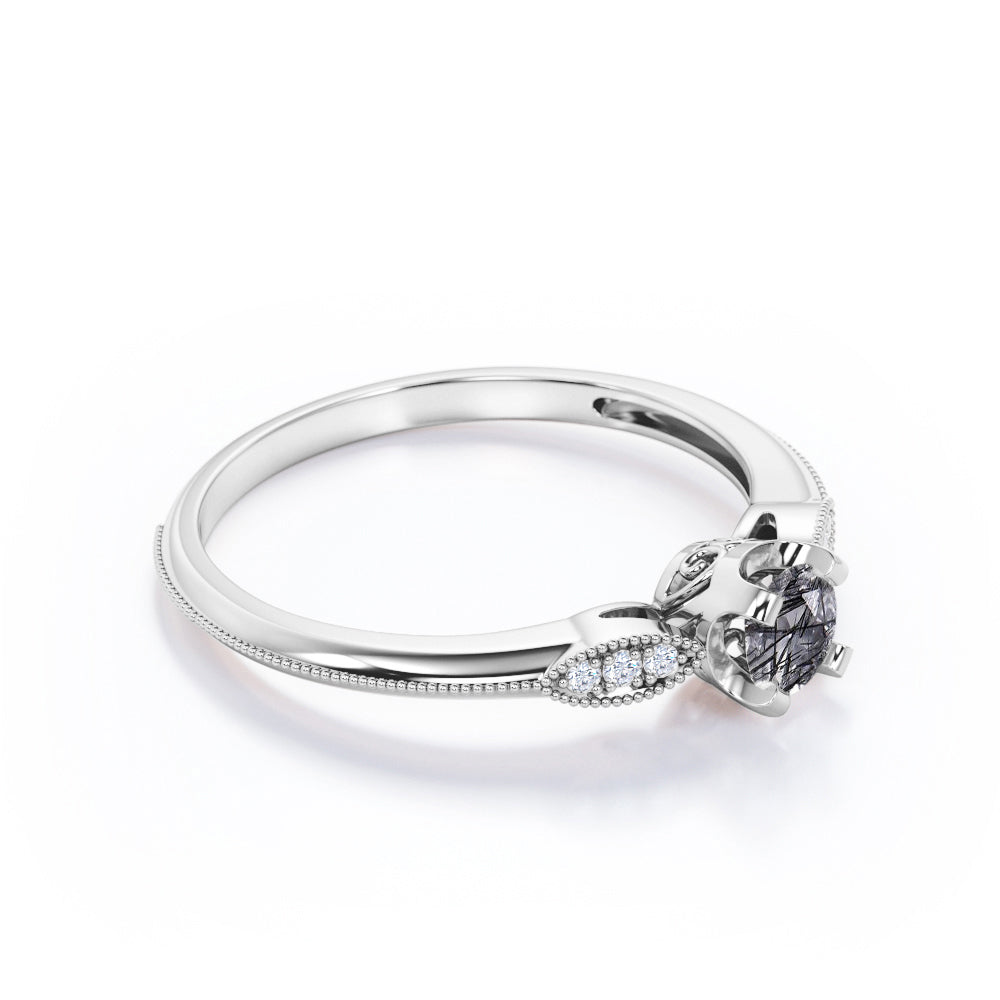 Create an incredibly beautiful look on her finger with this Modern 4 Prong Basket 1.50 Carat Round Cut Dendritic Black Rutilated Quartz and Diamond Pave Milgrain Engagement Ring in White Gold. This modern pave milgrain solid dendritic rutilated quartz engagement ring features 1.25 carat round cut real rutilated quartz and .25 carat real side diamond for gold ring and moissanite for silver ring. This 4 prong basket engagement ring can be customized to either 10k, 14K and Gold over Silver and either Black Gold, Rose Gold, White Gold or Yellow Gold. Also, as your satisfaction is our most priority, we will do our best to have your handmade jewelry be carefully and beautifully crafted by our expert jewelers. The order also comes with a 30-day full refund policy. This clear crystal with black needle inclusions ring will surely be a perfect gift for your significant other. It is believed to attract a good match, increase appeal, and fascinate with your own personality. This tourmalinated black rutilated quartz is believed to be a protection against the ill thoughts of others. Own this ring which displays a combination of quartz and rutile that creates an amazing vibration and stand out from the rest. With its distinctive shiny black needles, this genuine druzy rutilated quartz ring is sure to be eye-catching and bring all eyes on you. This ring is available at a very affordable price and available in both silver and gold ring. While many gemstones are most valuable when they contain few or no inclusions, rutilated quartz is actually prized because of its unique inclusions. Crowned as a powerful heeling stone, this rutilated quartz ring enhances will-power and determination of its wearer. Embellish her finger with this ring which is perfect for any occasion and everyday wear. It is the perfect match for those who are looking for a remarkable gemstone rings as rutilated quartz embodies their own unique intriguing patterns and uplifting meaning.