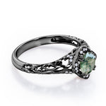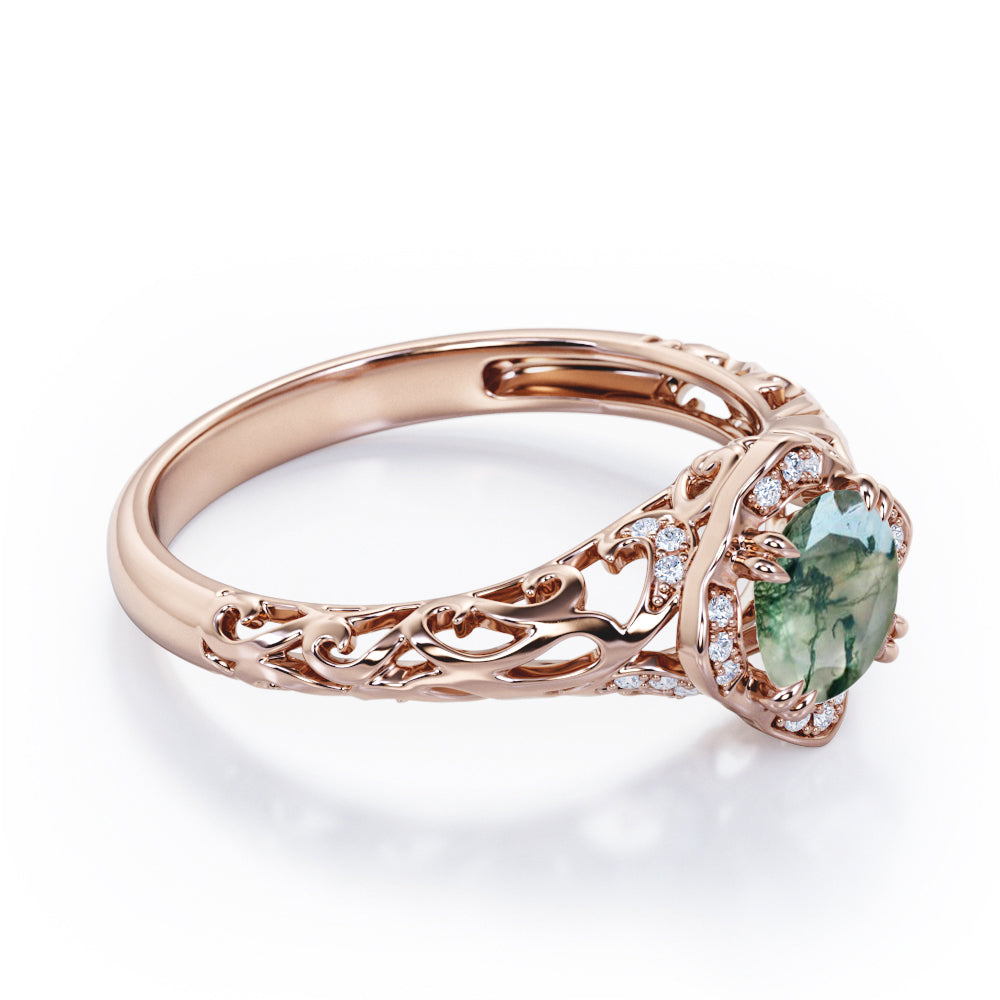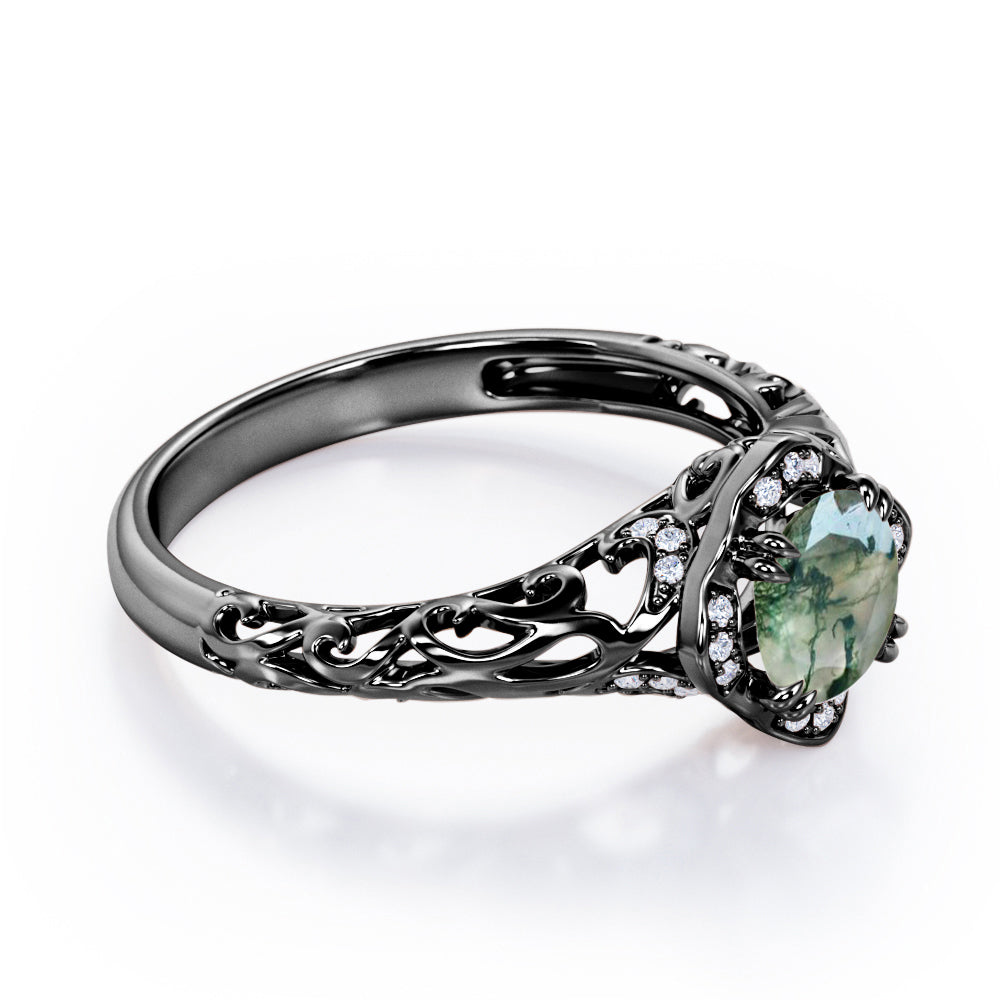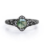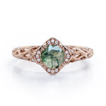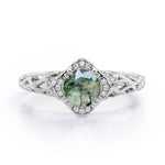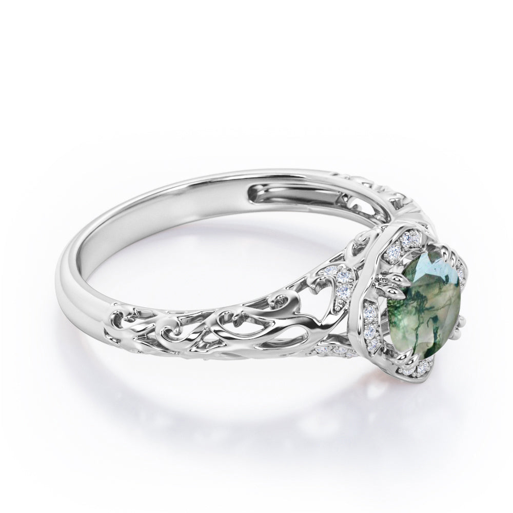 Modern Art Deco 1.10 Carat Round Cut Green Moss Agate And Diamond Cushion Framed Halo Engagement Ring In White Gold. Diamonds might be forever, but few gemstones are as mysteriously compelling as Green Moss Agate, making it the perfect unique engagement ring option. The art deco style and its affordability makes it extremely special and more than just a passing trend, and its ideal for brides who want something especially one-of-a-kind. This antique engagement ring is exceptional handwork of our experienced craftsmen. This modern art deco ring features 1 carat round cut green moss agate at the center held by eight claws and is filled with art deco work in a white gold band. This modern art deco 1.10 carat round cut green moss agate and diamond cushion framed halo engagement ring in white gold for her can also be customized to 18k Gold plating over silver, 10k Gold or 14k Gold or as per your preference. Please note that if the ring is made over silver, the side stone will be moissanite and if it is made on gold, diamond will be employed as the side stone.