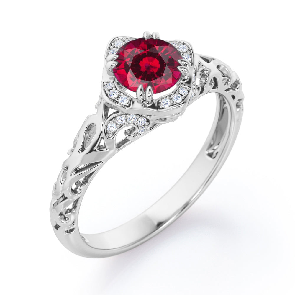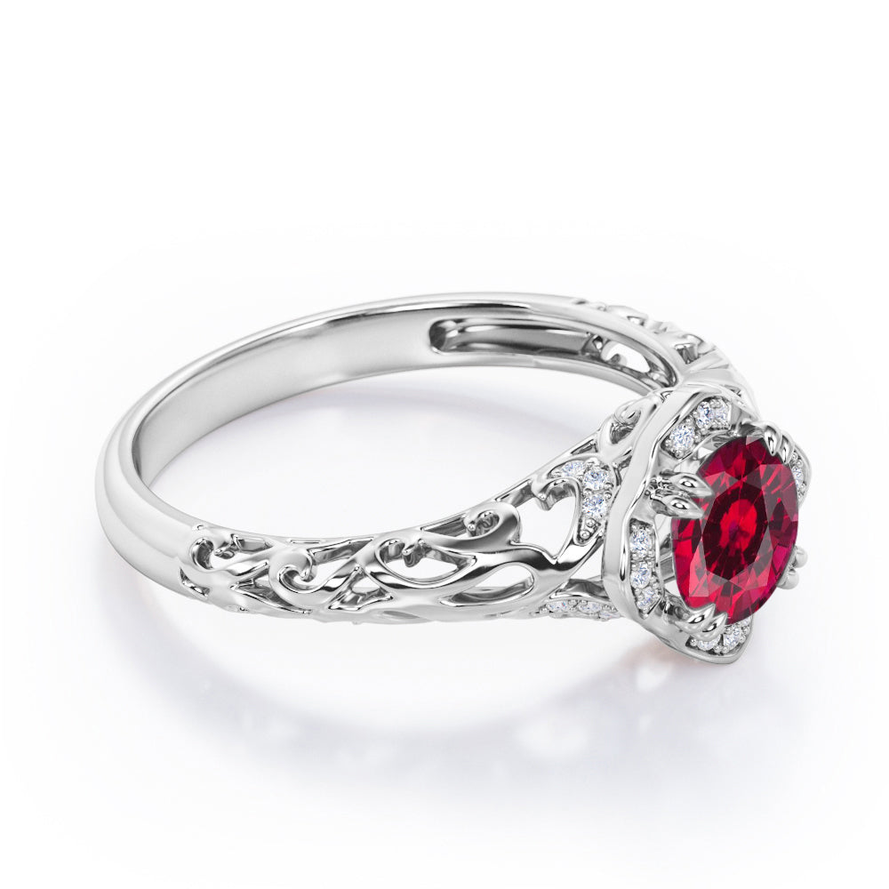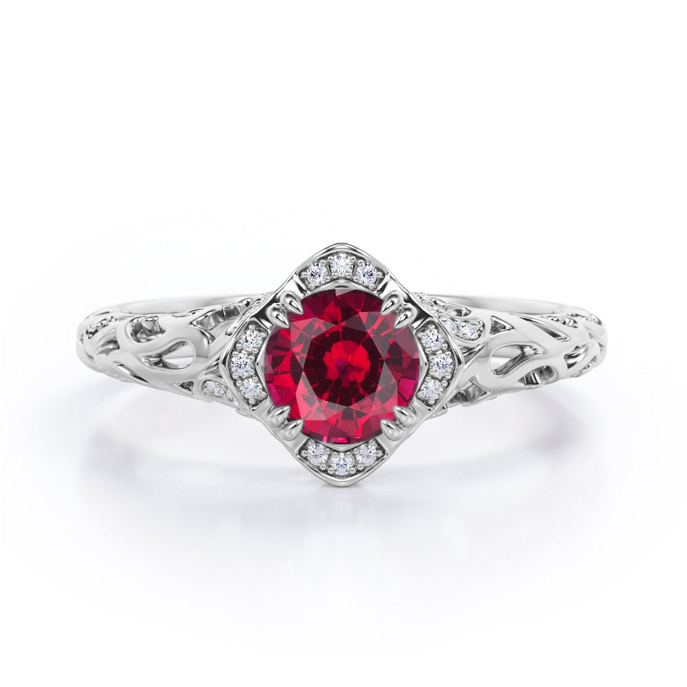 Modern Art Deco 1.10 Carat Round Cut Lab Ruby And Diamond Cushion Framed Halo Engagement Ring In White Gold. Diamonds might be forever, but few gemstones are as mysteriously compelling as Lab Ruby, making it the perfect unique engagement ring option. The art deco style and its affordability makes it extremely special and more than just a passing trend, and its ideal for brides who want something especially one-of-a-kind. This antique engagement ring is exceptional handwork of our experienced craftsmen. This modern art deco ring features 1 carat round cut Lab Ruby at the center held by eight claws and is filled with art deco work in a white gold band. This modern art deco 1.10 carat round cut Lab Ruby and diamond cushion framed halo engagement ring in white gold for her can also be customized to 18k Gold plating over silver, 10k Gold or 14k Gold or as per your preference. Please note that if the ring is made over silver, the side stone will be moissanite and if it is made on gold, diamond will be employed as the side stone.