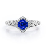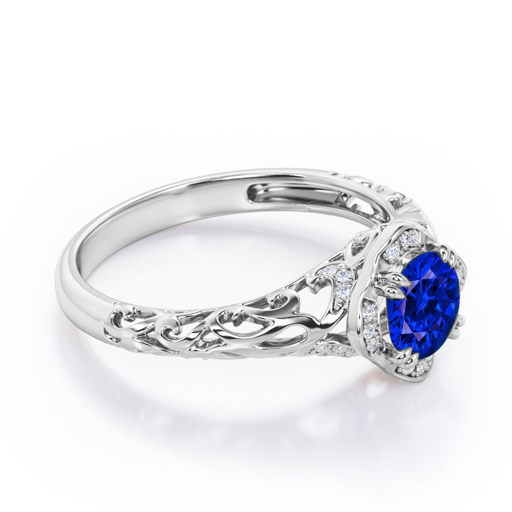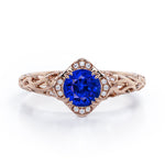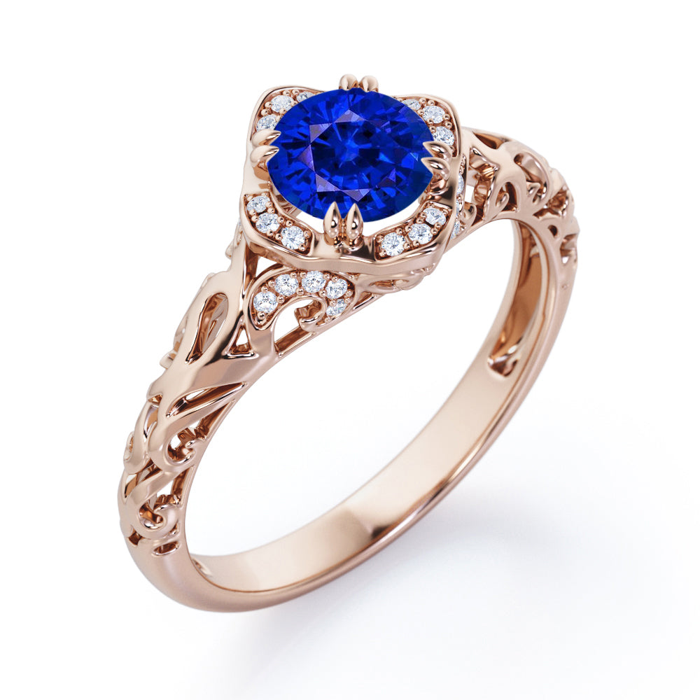 Modern Art Deco 1.10 Carat Round Cut Sapphire And Diamond Cushion Framed Halo Engagement Ring In Rose Gold. Diamonds might be forever, but few gemstones are as mysteriously compelling as sapphire, making it the perfect unique engagement ring option. The art deco style and its affordability makes it extremely special and more than just a passing trend, and its ideal for brides who want something especially one-of-a-kind. This antique engagement ring is exceptional handwork of our experienced craftsmen. This modern art deco ring features 1 carat round cut sapphire at the center held by eight claws and is filled with art deco work in a rose gold band. This modern art deco 1.10 carat round cut sapphire and diamond cushion framed halo engagement ring in rose gold for her can also be customised to 18k Gold plating over silver, 10k Gold or 14k Gold or as per your preference. Please note that if the ring is made over silver, the side stone will be moissanite and if it is made on gold, diamond will be employed as the side stone.
