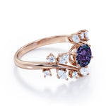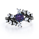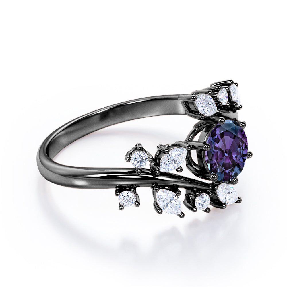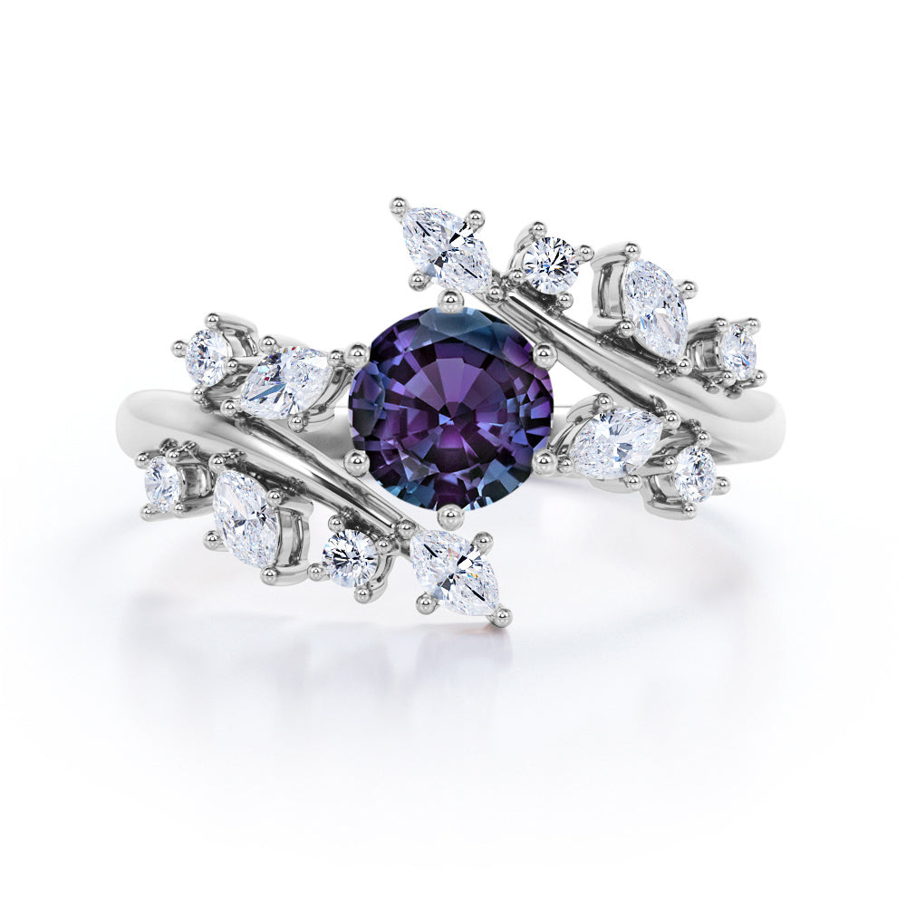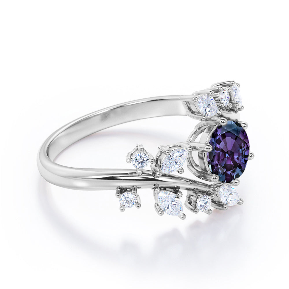 Modern Art Deco 0.85 Carat Round Cut Lab Created Alexandrite Nature Inspired Floral Engagement Ring. A delicate engagement ring for all of the minimalist and nature lovers out there. A brilliant round cut Moissanite (or) diamond is set on band. The setting employs a loop fastening that separates the stone from the band itself and is quite unique in the world of bridal jewelry. 0.5 carat lab made alexandrite sits in the center held by six prongs and 0.35 carat round shape moissanites (or) diamonds and marquise cut Cubic Zirconia is enhanced in the band in a leaf like pattern. Not only do the bands of this ring give a timeless aesthetic, but the purple alexandrite stone at the center also makes the entire ring saturated in color. This nature inspired engagement ring gives a mystic feminine twist to this alexandrite floral ring. Handmade with detailed attention and deep love, this modern art deco 1.35 carat round cut lab created alexandrite nature inspired floral engagement ring can also be customized to 18k Gold plating over silver, 10k Gold or 14k Gold as you desire.